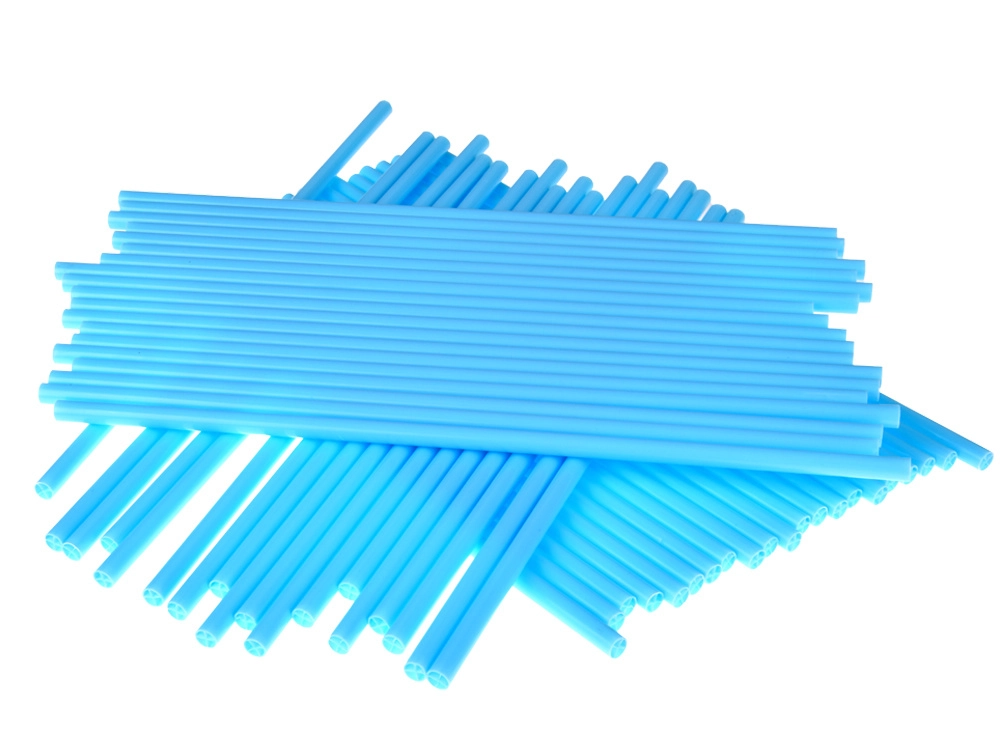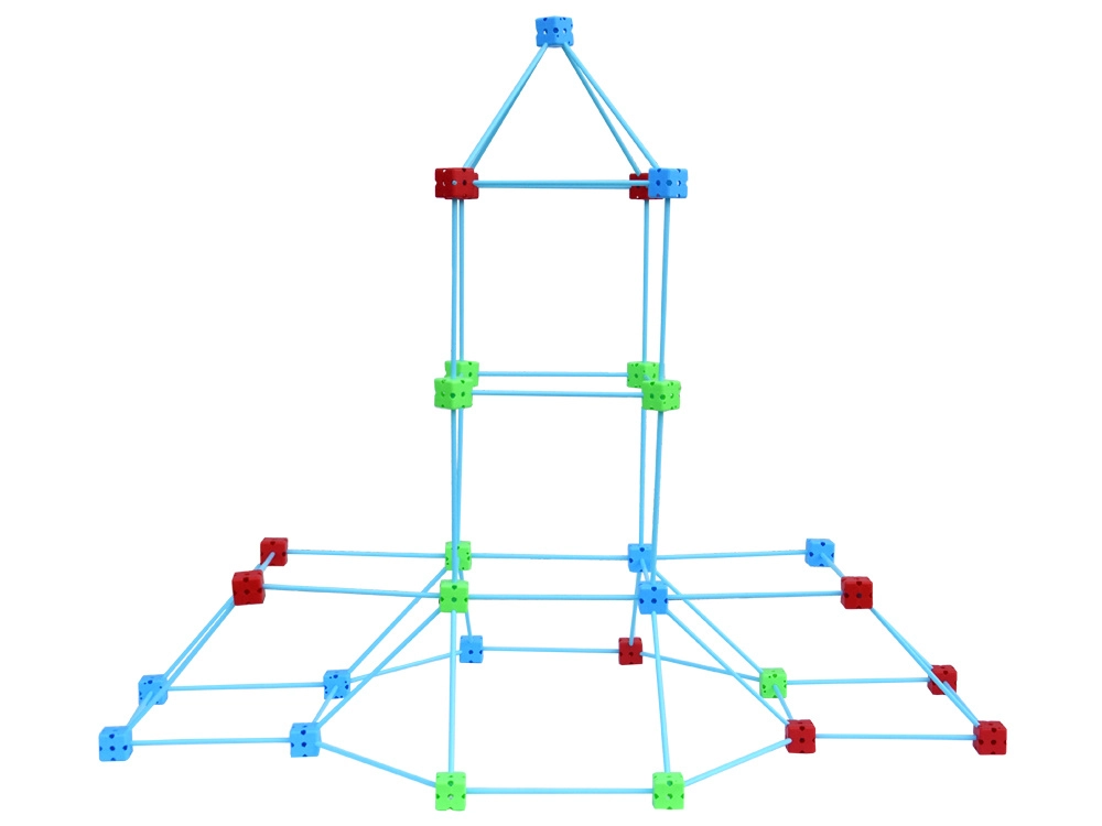 Lange hellblaue Stäbe sind leicht und robust. Sie sitzen fest in den Verbindern, wodurch die Konstruktionen stabil und dennoch leicht umzuplatzieren sind.