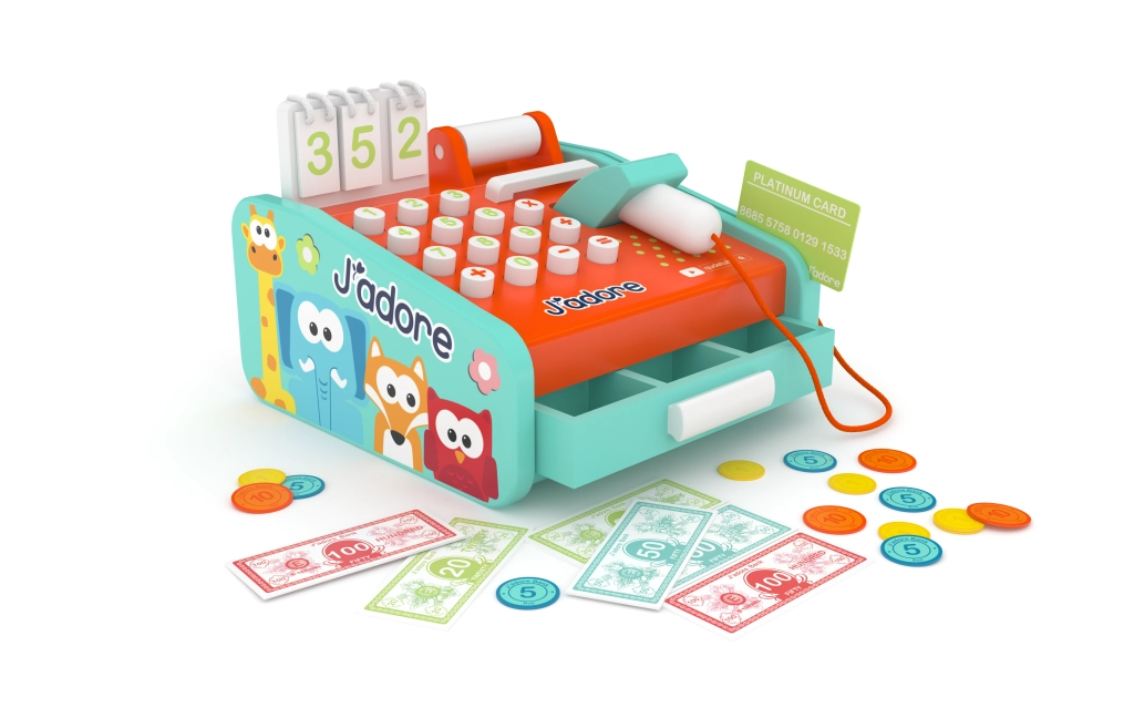 Die Kasse bietet Tasten, eine ausziehbare Geldschublade und Zubehör, mit denen Kinder Zahlungen annehmen und „Wechselgeld“ herausgeben können. Hergestellt aus umweltfreundlichen und sicheren Materialien, robust für den täglichen Gebrauch.