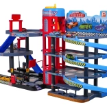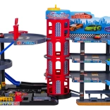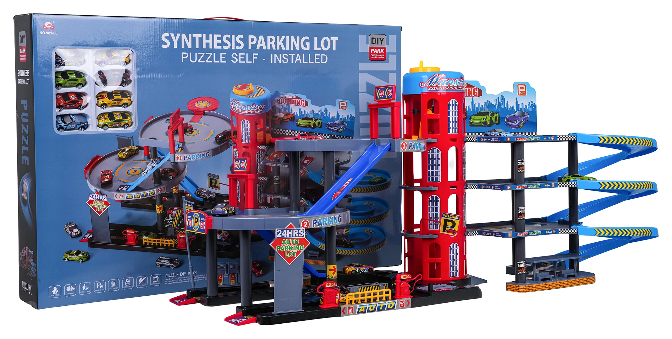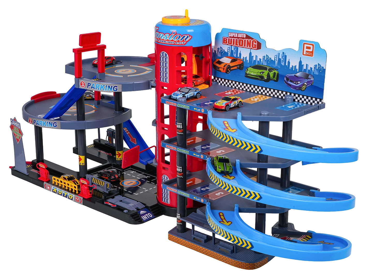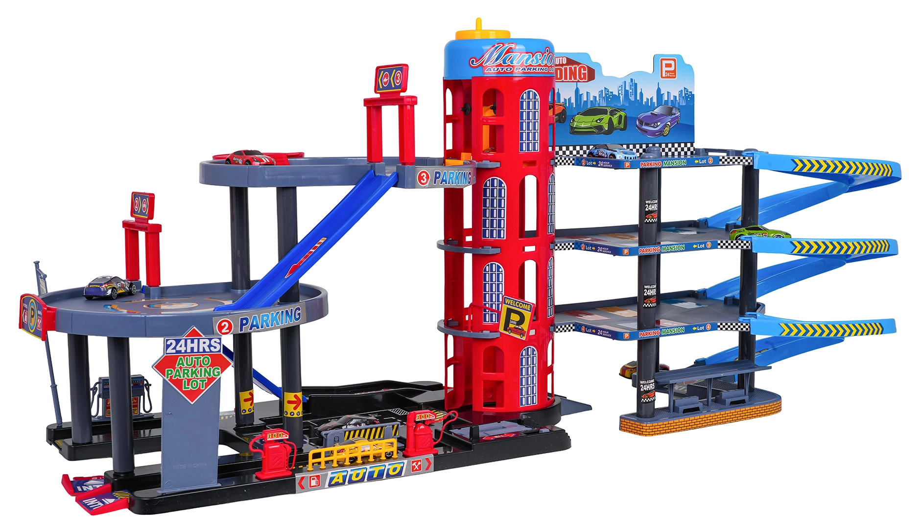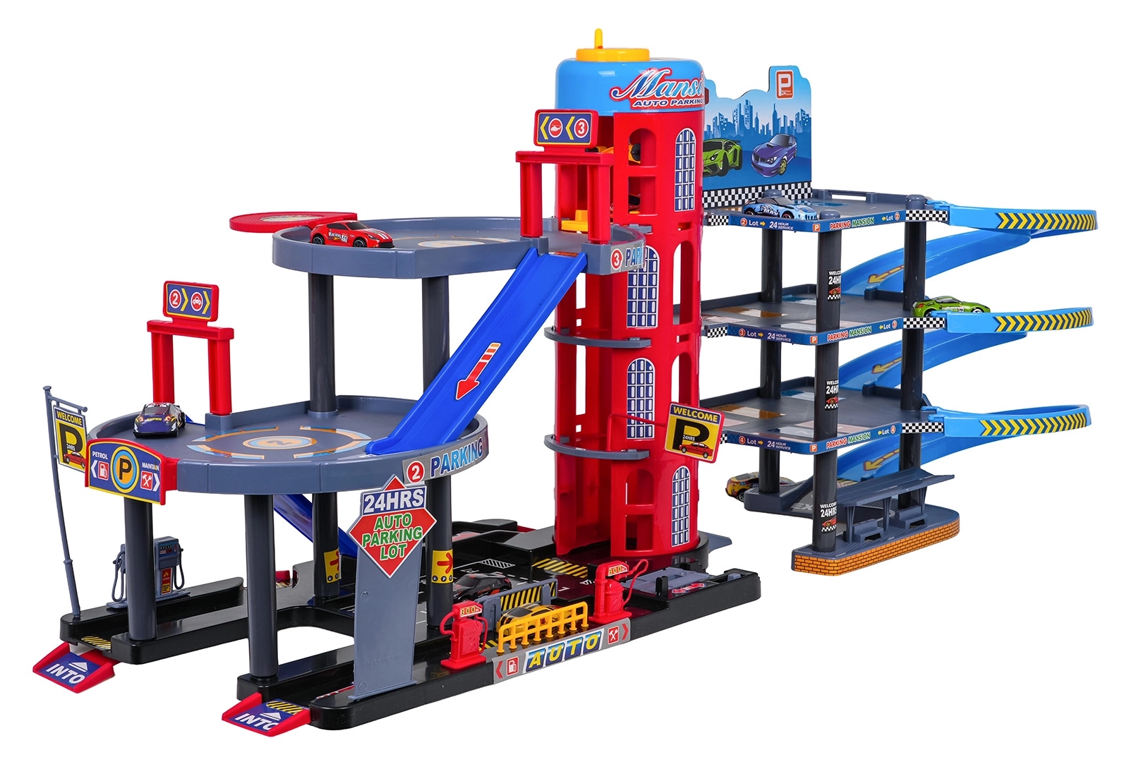 Entdecken Sie die Welt der Autos und Rennen mit einem robusten Parkhaus, das vier Etagen mit markierten Fahrspuren, Parkplätzen und Verkehrsbeschilderung bietet. Die Autos bringen Sie mithilfe eines manuell bedienbaren Aufzugs nach oben und schicken sie über spiralförmige Rampen oder erneut mit dem Aufzug nach unten. Eine Zapfsäule sowie ein Heliport sorgen für noch kreativeres Spiel.