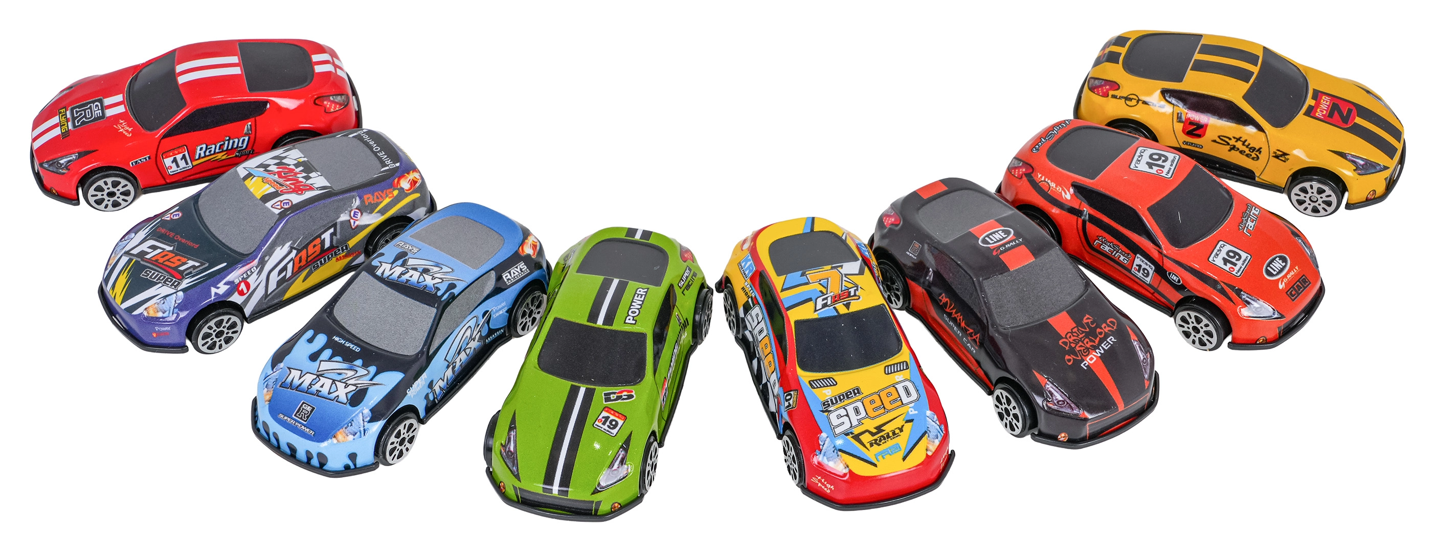 Vielseitiges Set mit farbigen Modellen und Metallkarosserie – bereit für Rennen und Parken.