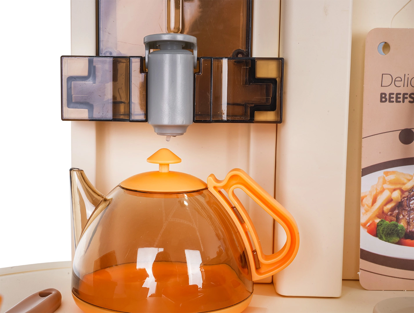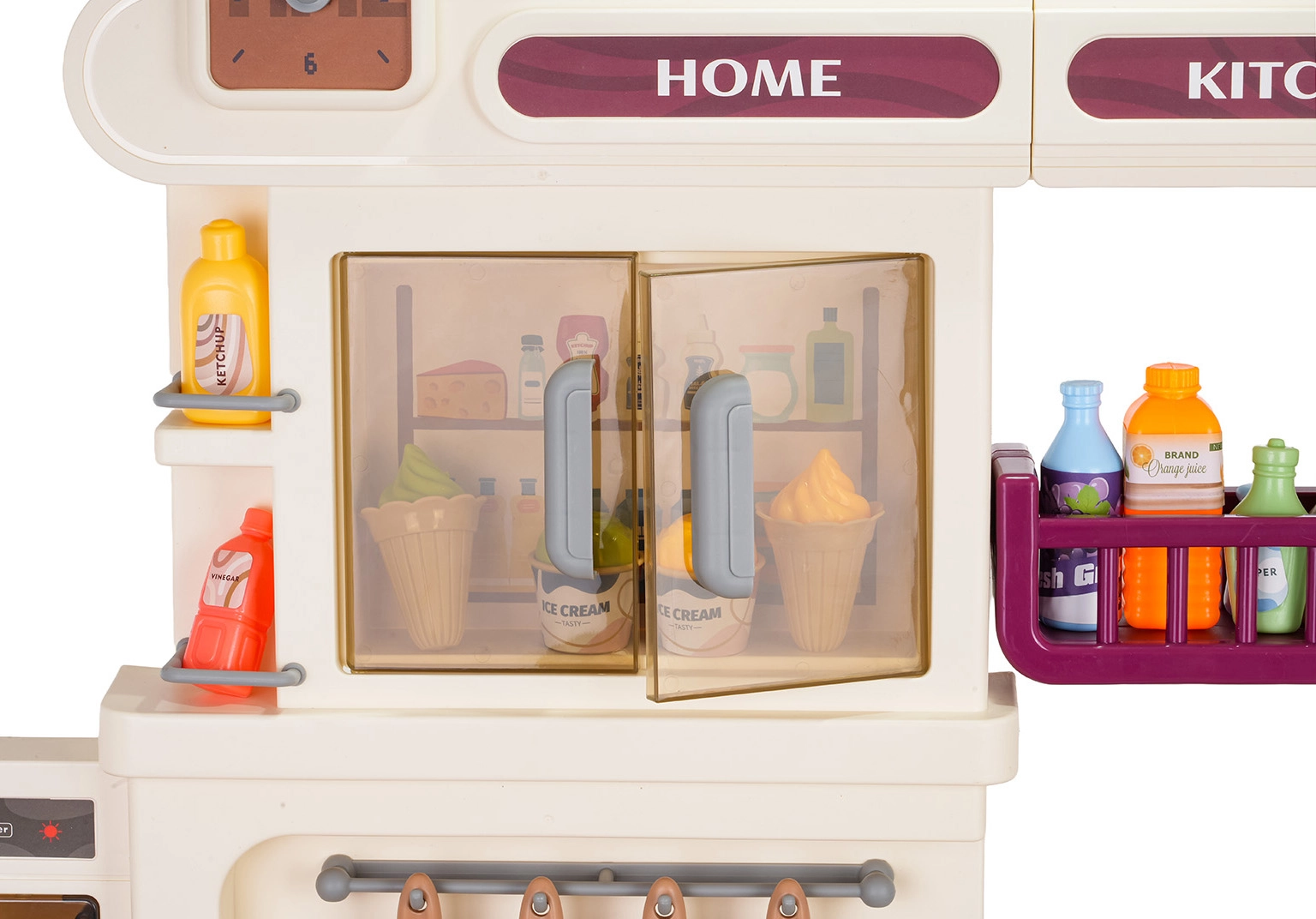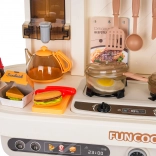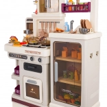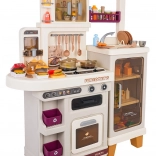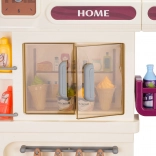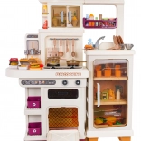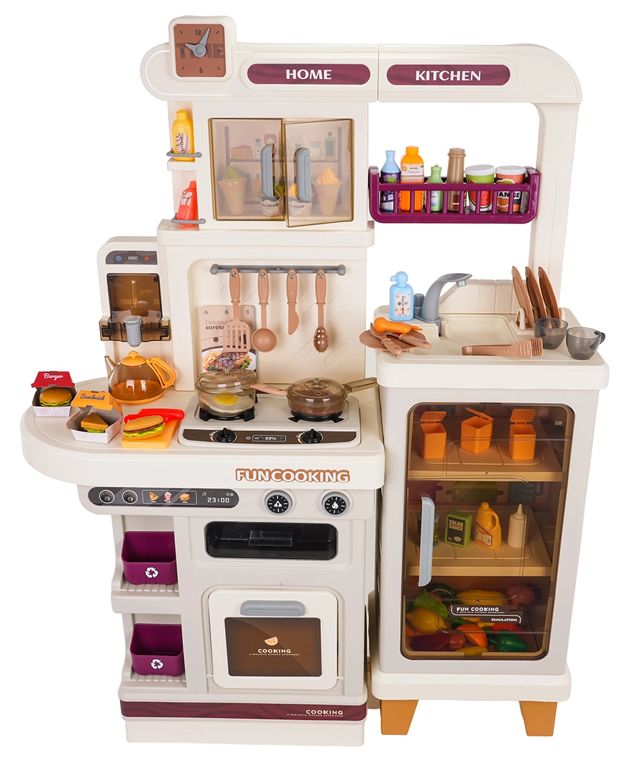 Diese multifunktionale Küche in elegantem Beigeton besteht aus hochwertigem, robustem Kunststoff und begeistert Kinder mit realistischen Funktionen. Die beleuchteten Kochfelder erzeugen Koch- und Bratgeräusche, aus einem Kochfeld steigt feiner Dampf auf und aus dem funktionierenden Wasserhahn fließt Wasser. Der öffnende Backofen und der Kühlschrank sowie Regale und Haken halten sämtliches Zubehör ordentlich an seinem Platz.