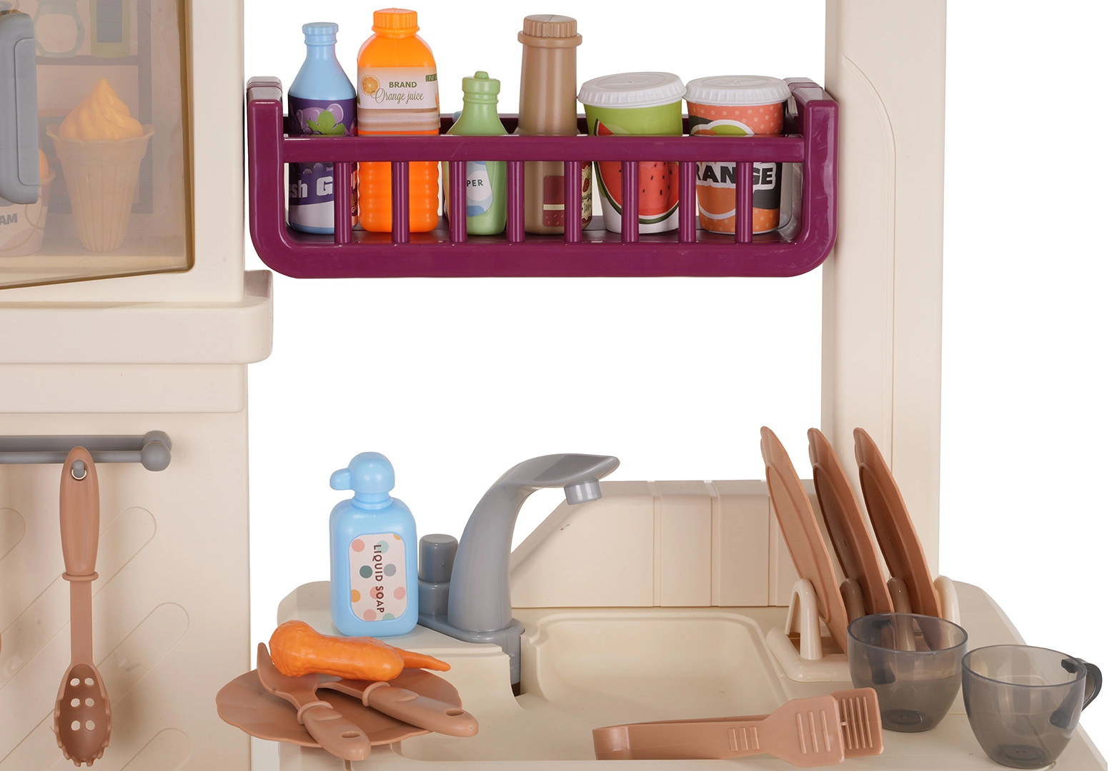 Aus dem Wasserhahn fließt wirklich Wasser, während Kühlschrank, Backofen, Schränke und Regale sämtliches Zubehör aufnehmen und die Spielecke ordentlich halten.