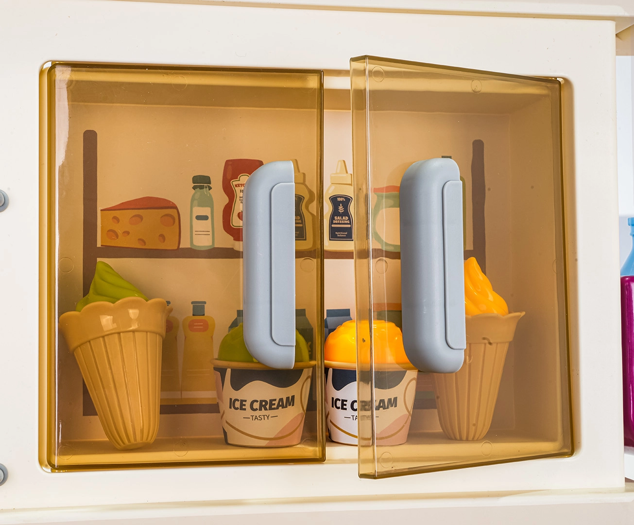 Im Lieferumfang befinden sich 93 Teile – Töpfe, Pfanne, Kanne, Geschirr, Besteck, Küchenutensilien, Gewürzstreuer, Mülleimer sowie eine große Auswahl an Lebensmitteln und Getränken. Uhr mit beweglichen Zeigern und Menü-Kärtchen sorgen für noch mehr Fantasie. Die Küche ist ideal zur Förderung der Feinmotorik, sozialer Kompetenzen und kreativen Spiels.