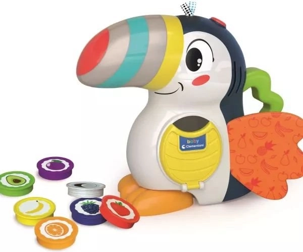 Der interaktive Tukan Adrian von CLEMENTONI BABY ist ein großartiger Begleiter für die ersten Entdeckungen der Welt. Nach dem Einlegen eines Chips in den Schnabel reagiert der Tukan sofort – der Schnabel leuchtet in der Farbe des eingelegten Obstes, der Chip wird erkannt und laut benannt. So verstehen Kinder spielerisch Ursache und Wirkung und lernen Farben sowie Obstnamen auf unterhaltsame Weise.
