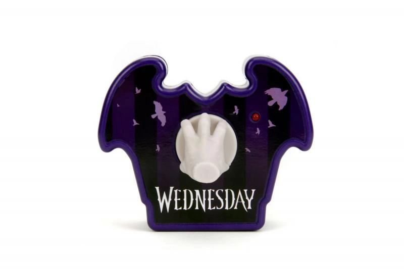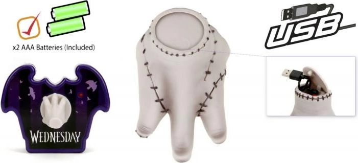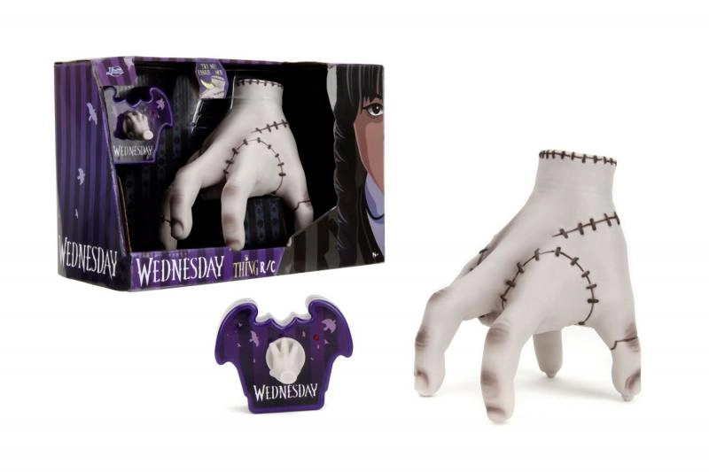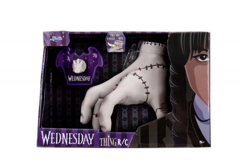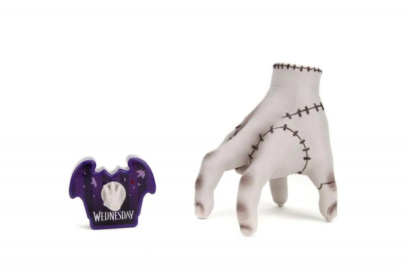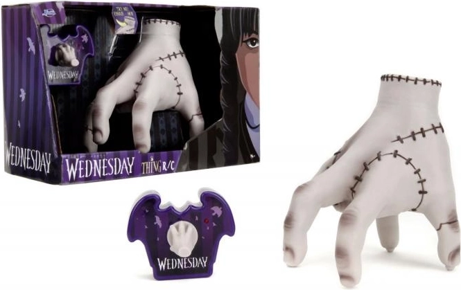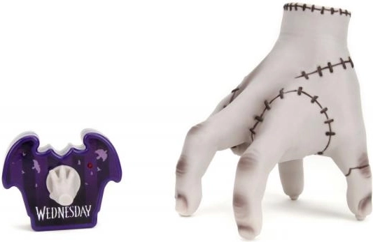 Entdecken Sie die Kultfigur Thing aus der Serie WEDNESDAY als spaßige ferngesteuerte Figur mit 16 cm Höhe von Jada Toys. Inklusive stylischer lila Fledermaus-Fernbedienung mit einer kleinen Hand als Joystick. Einfach Batterien einsetzen, die Oberseite des Spielzeugs drücken und die Hand beginnt sich zu bewegen – ein perfektes Geschenk für Kinder und erwachsene Fans.