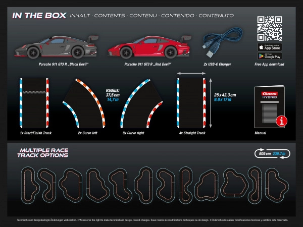 Die Zusammenstellung umfasst 2 Fahrzeuge Porsche 911 GT3, Geraden, Kurven und ein START/ZIEL-Teil. Die Bahn ist leicht auf- und abzubauen, 25 cm breit und ermöglicht Überholmanöver auf Geraden und in Kurven, auch abseits der Strecke mit der BOOST-Funktion. Dank hochwertiger Verarbeitung eignet sich das Set für anspruchsvolle Spieler und Einsteiger ab 12 Jahren.