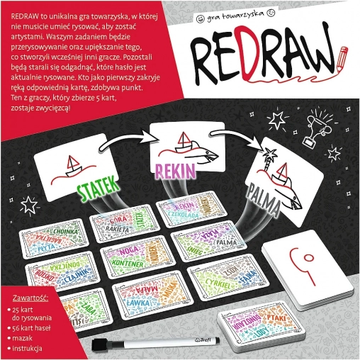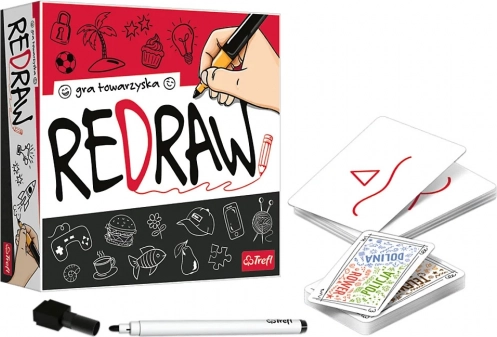 Entdecken Sie das Partyspiel Redraw von TREFL, das Zeichnen, Raten und jede Menge Lachen verbindet. Auch wenn Sie denken, dass Sie nicht zeichnen können, genießen Sie rasantes, dynamisches Gameplay, einfache Regeln und 168 verschiedene Begriffe. Die Spieler wechseln sich beim Überzeichnen und Verbessern der Bilder ab, während die anderen den richtigen Begriff erraten. Der erste, der 5 Karten sammelt, gewinnt.