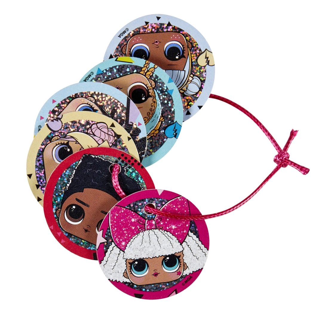 Fädeln Sie die farbigen Marken mit L.O.L.-Motiven auf eine Schnur und gestalten Sie ein originelles Armband, das Sie jeden Tag tragen können.