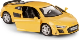 Das lizenzierte Modell AUDI R8 2019 in auffälligem Gelb bildet die ikonischen Linien und Proportionen des Originals naturgetreu ab. Dank der zu öffnenden Türen erhalten Sie Einblick in den detaillierten Innenraum. Der Rückzugantrieb sorgt nach kurzem Zurückziehen für eine flotte Vorwärtsfahrt.