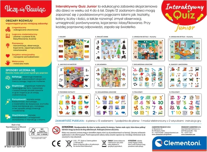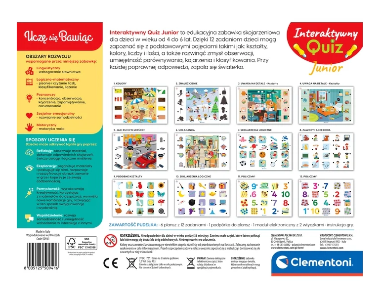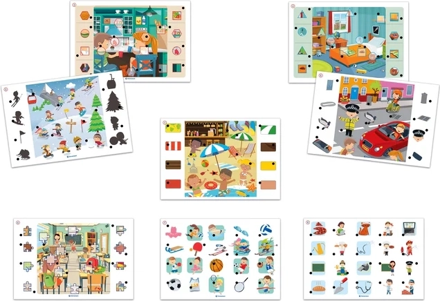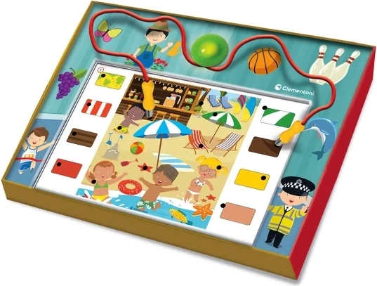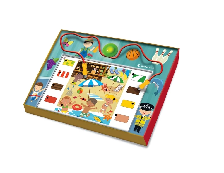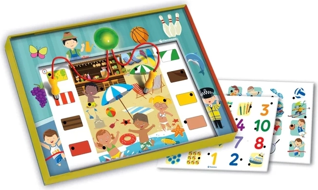 Zum Lieferumfang gehören 6 beidseitige Spieltafeln mit 12 Aufgaben, ein elektronisches Modul mit zwei Steckkontakten sowie ein praktischer Ständer für die Tafeln. Das Spiel eignet sich sowohl für das selbstständige Spielen als auch für gemeinsame Aktivitäten mit den Eltern und hält dank der reichhaltigen Illustrationen die Aufmerksamkeit der Kinder lange aufrecht.