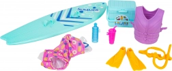 4 Puppen (Mama, Papa, Tochter, Baby), Surfbrett, Rettungsweste, Flossen, Maske/Sauerstoff-Set, Badebekleidung, Kühlbox, 2 Getränkeflaschen/Becher, Schwimmring