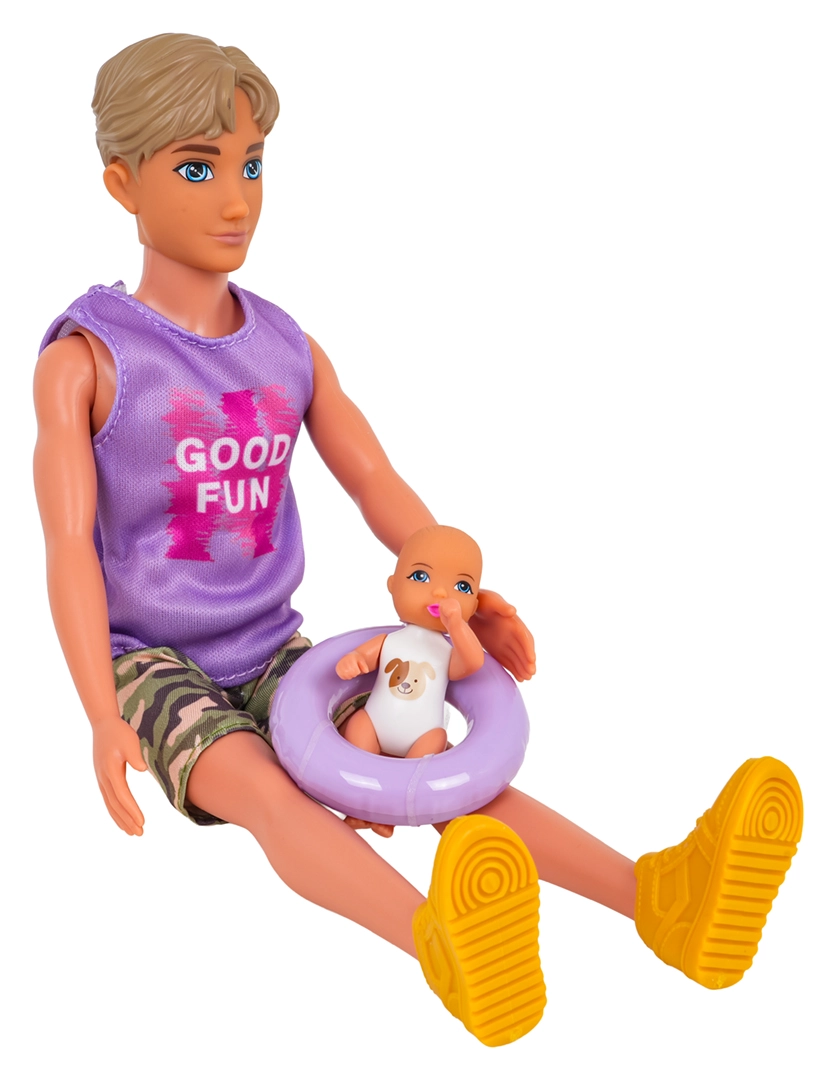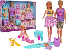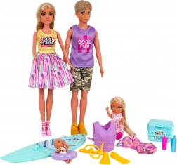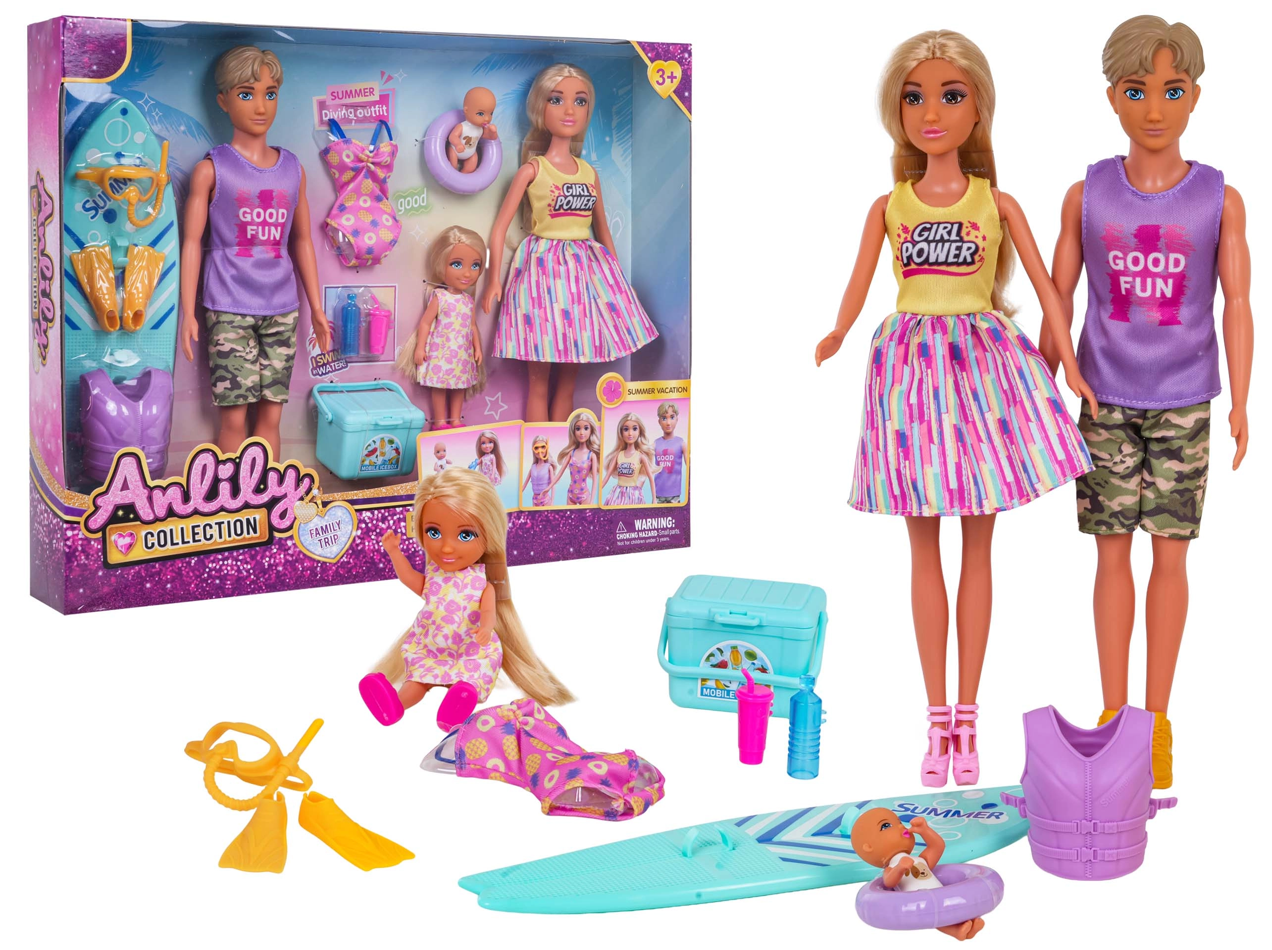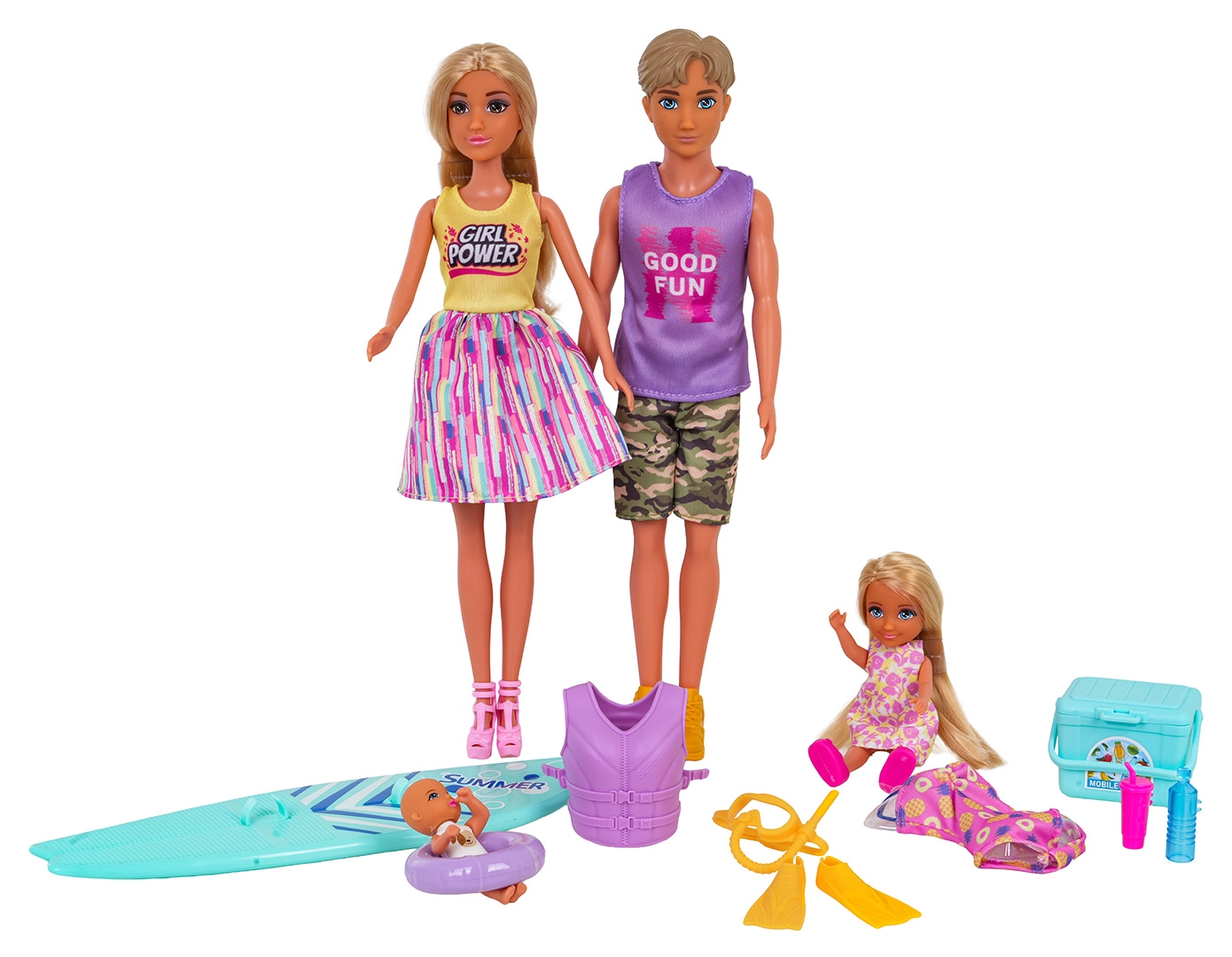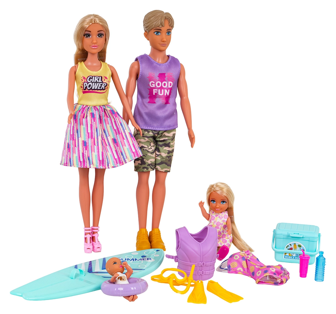 Genießen Sie sommerliche Abenteuer mit diesem Familien-Strandset – Mama, Papa, Tochter und Baby sowie jede Menge Zubehör zum Surfen und Baden. Enthalten sind unter anderem Surfbrett, Rettungsweste, Flossen, Schwimmring und eine Kühlbox für Getränke. Die Puppen haben bewegliche Gliedmaßen und lassen sich leicht umziehen – ideal für kreatives Rollenspiel, Förderung der Fantasie und stundenlangen Spielspaß.
