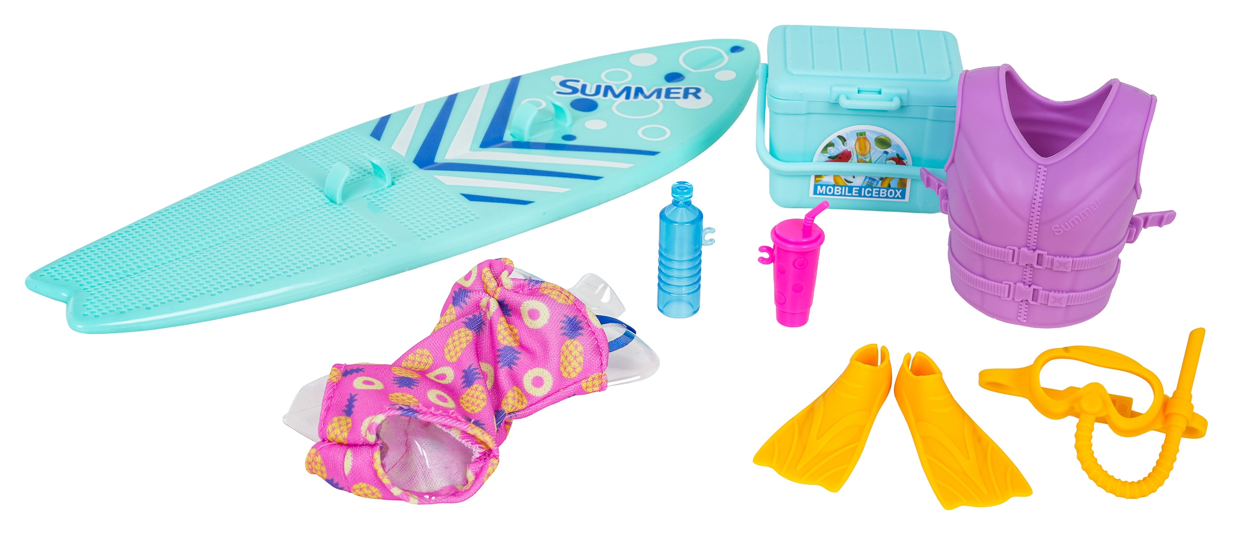Dank Surfbrett, Flossen, Rettungsweste und aufblasbarem Schwimmring können Kinder unzählige Geschichten vom Surfen bis zum sicheren Baden erfinden. Die Kühlbox für Getränke und Becher runden jedes Strandabenteuer ab. Die Puppen haben bewegliche Arme, Beine und Köpfe und lassen sich zum realistischen Spielen leicht setzen oder hinstellen.