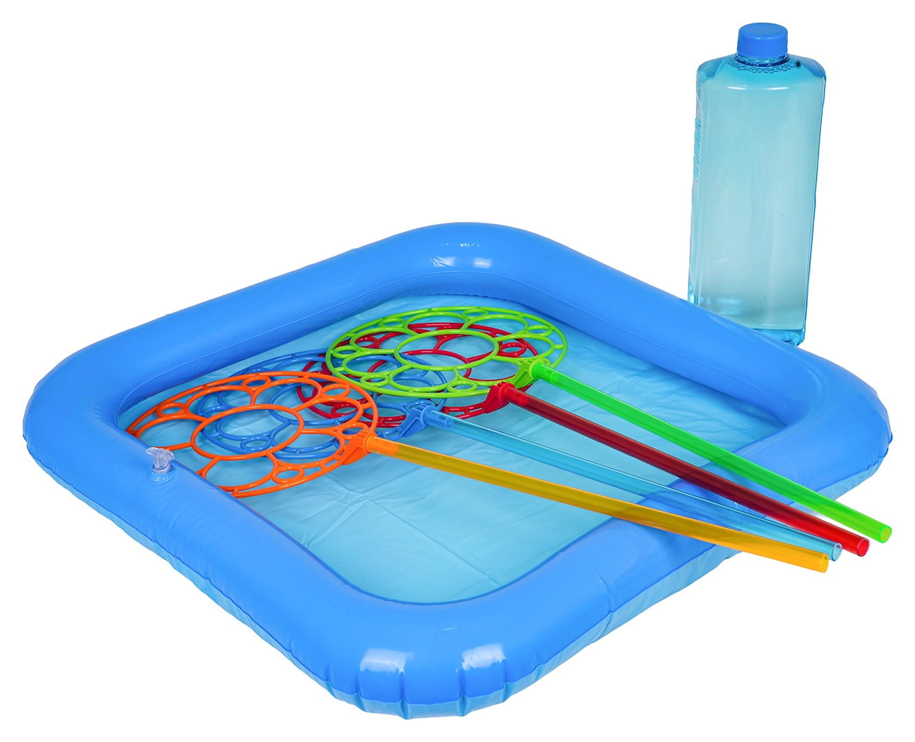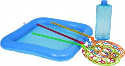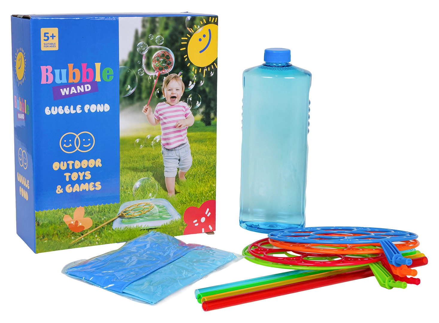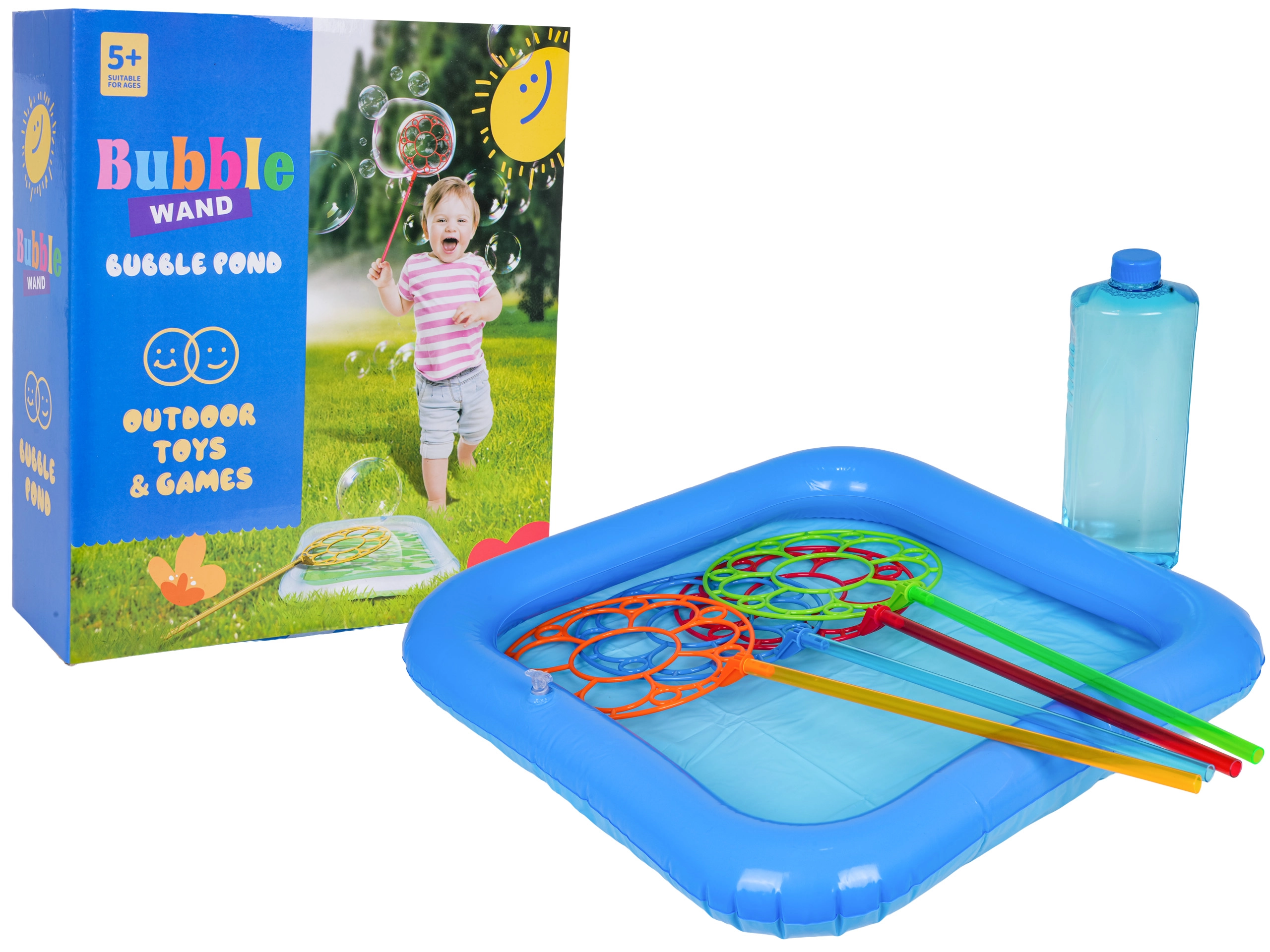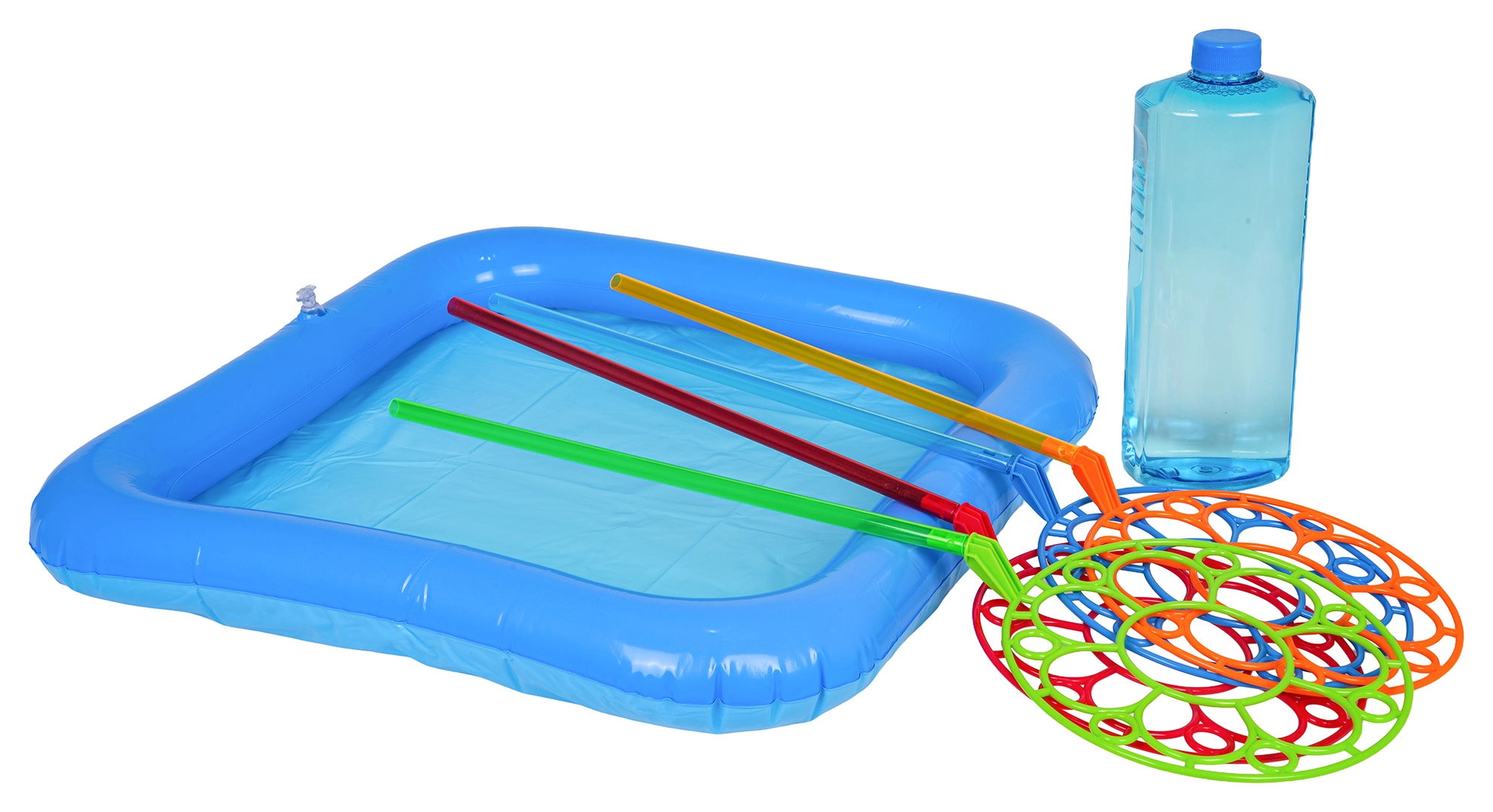 Mit diesem Set erstellen Kinder mühelos gigantische Seifenblasen. Gießen Sie die Lösung einfach in das aufblasbare Becken, tauchen Sie einen der Ringe ein und pusten Sie – für Lächeln und Freude ist gesorgt. Ideal für Familienfeste und Spiele mit Freunden an der frischen Luft.