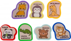Enthalten sind 7 Kontinente und 7 Tier-Pins. Nach dem Einsetzen eines Pins ertönen der Name des Kontinents, des Tiers und sein typisches Geräusch – Lernen, das Spaß macht.