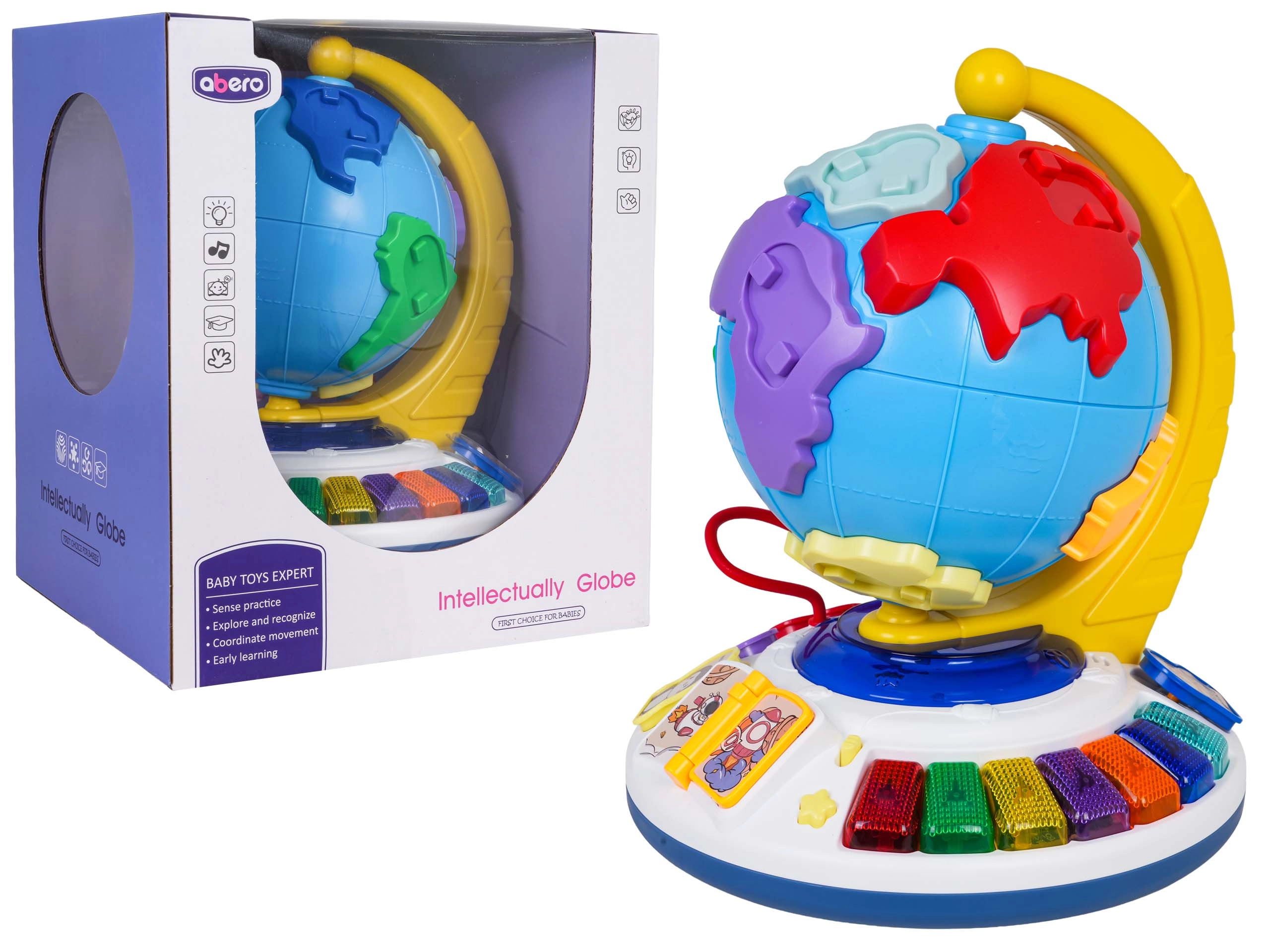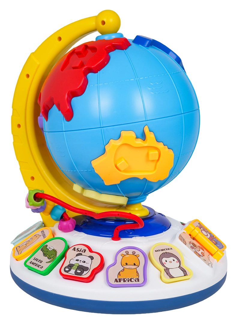 Der Globus dreht sich frei auf einer stabilen Basis. Das umblätterbare Büchlein startet Melodien und die Perlenbahn trainiert die Feinmotorik.