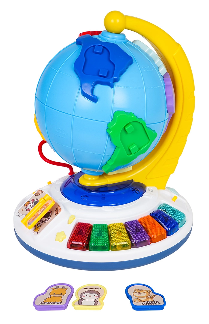 Auf der stabilen Basis finden Sie ein leuchtendes Piano mit farbigen Tasten, ein umblätterbares Büchlein zum Starten von Melodien und eine Perlenbahn zur Förderung der Feinmotorik. Beim Einsetzen eines Tier-Pins in die Auswahl ertönen der Name des Kontinents, des Tiers und sein charakteristischer Laut – Lernen geschieht spielerisch und ganz natürlich.