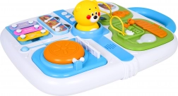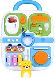 Dieser blaue Beschäftigungskoffer ist die ideale Wahl für kleine Entdecker. Er bietet eine bunte Vielfalt an Aktivitäten, die die kindliche Neugier anregen – von Türchen mit Schlüssel über ausziehbare Elemente und Drehregler bis hin zum Lichteffekt der Lampe nach dem Einstecken des Kabels. Der Bär in der Mitte quietscht beim Drücken und drei Tasten (Kreis, Dreieck, Quadrat) spielen Melodien und lustige Geräusche ab.