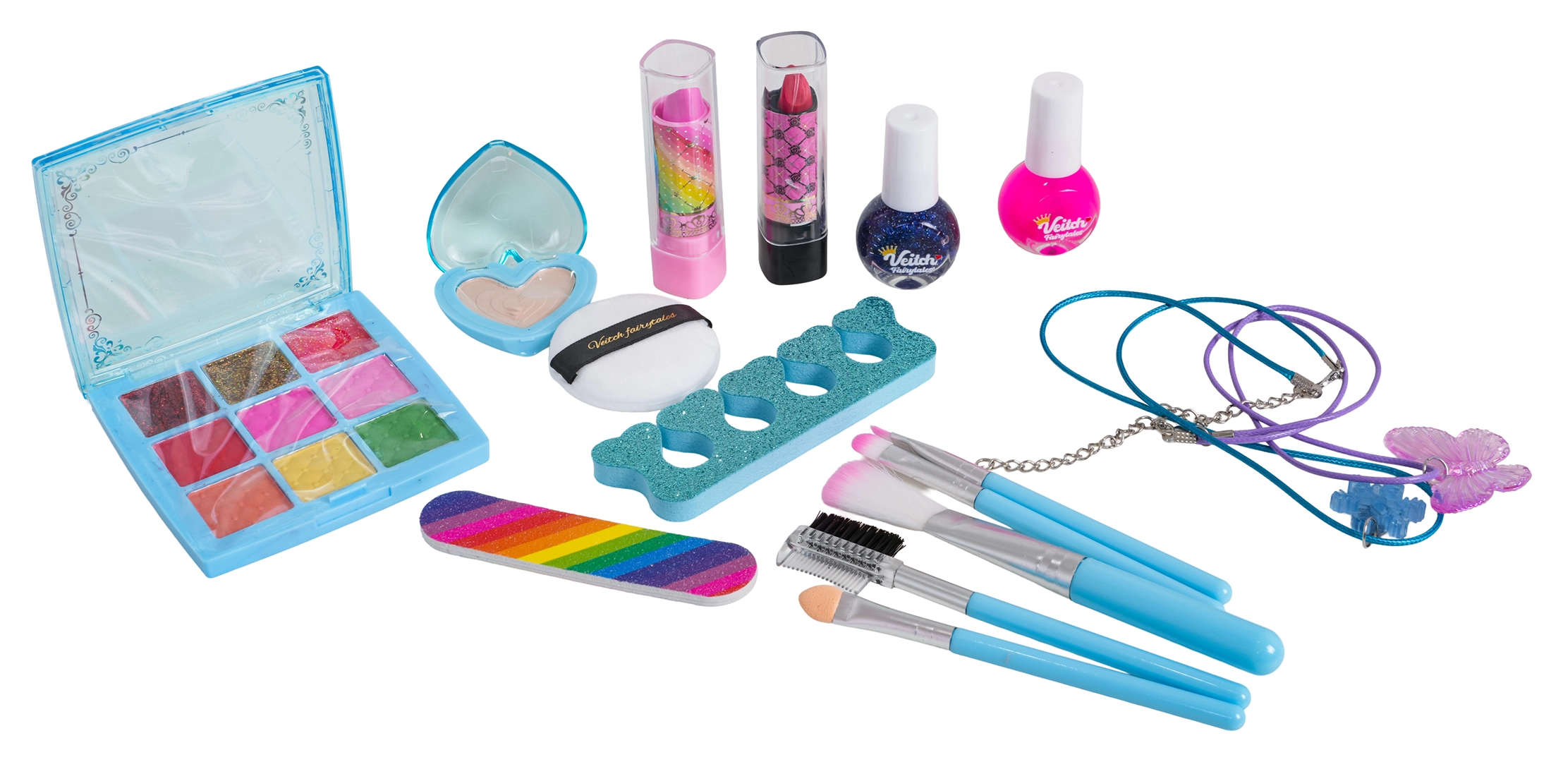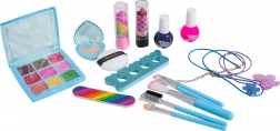 Lidschatten-Palette, Glosse, Lippenstifte, Nagellacke, Pinsel, Feile und Zehenseparator – alles in einem praktischen Set.