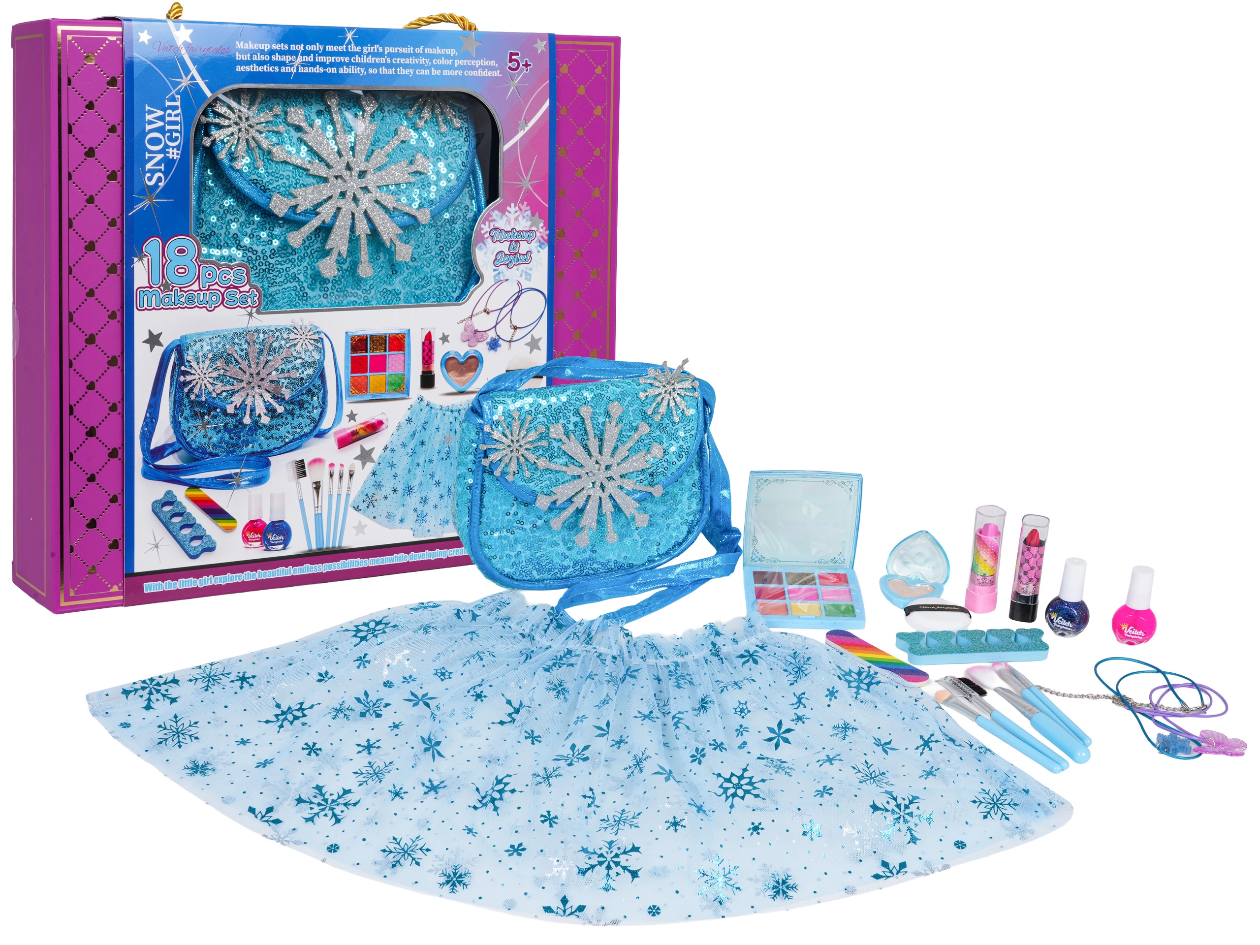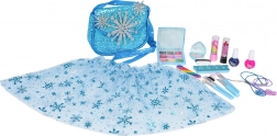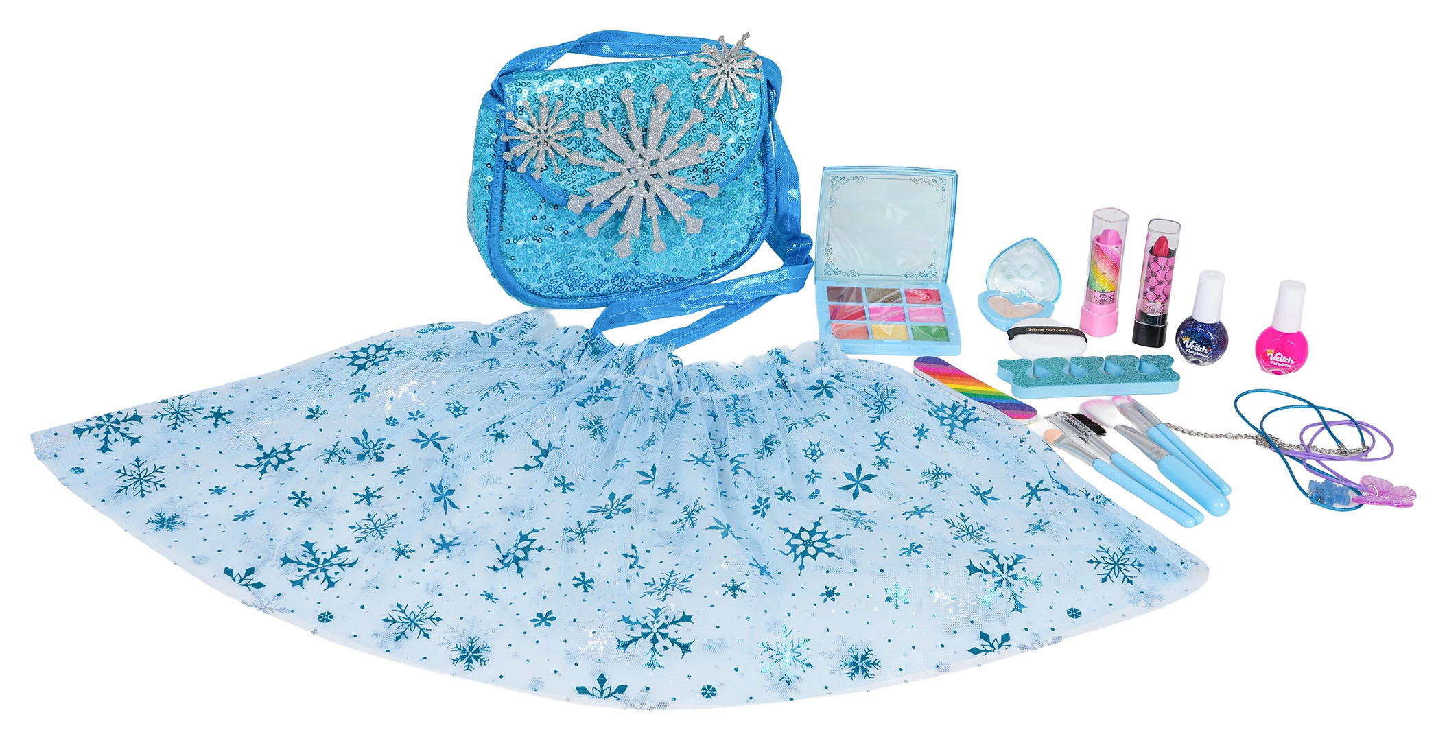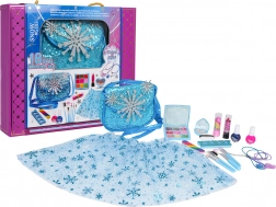 Dazugehörig sind ein dreilagiges Tüllröckchen mit Schneeflocken, eine elegante Umhängetasche und eine praktische Kosmetikpalette, Lacke, Glosse, Pinsel sowie Accessoires für Haare und Nägel. Alles kommt in einer Geschenkverpackung mit Tragegriff – ideal als Geschenk.