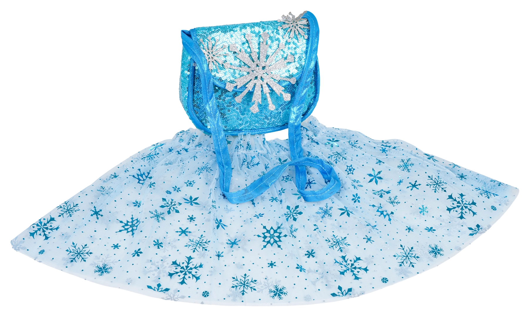 Das leichte Tüllröckchen mit Schneeflocken und die passende glitzernde Handtasche zaubern ein perfektes Eisprinzessinnen-Outfit für jedes kleine Mädchen.