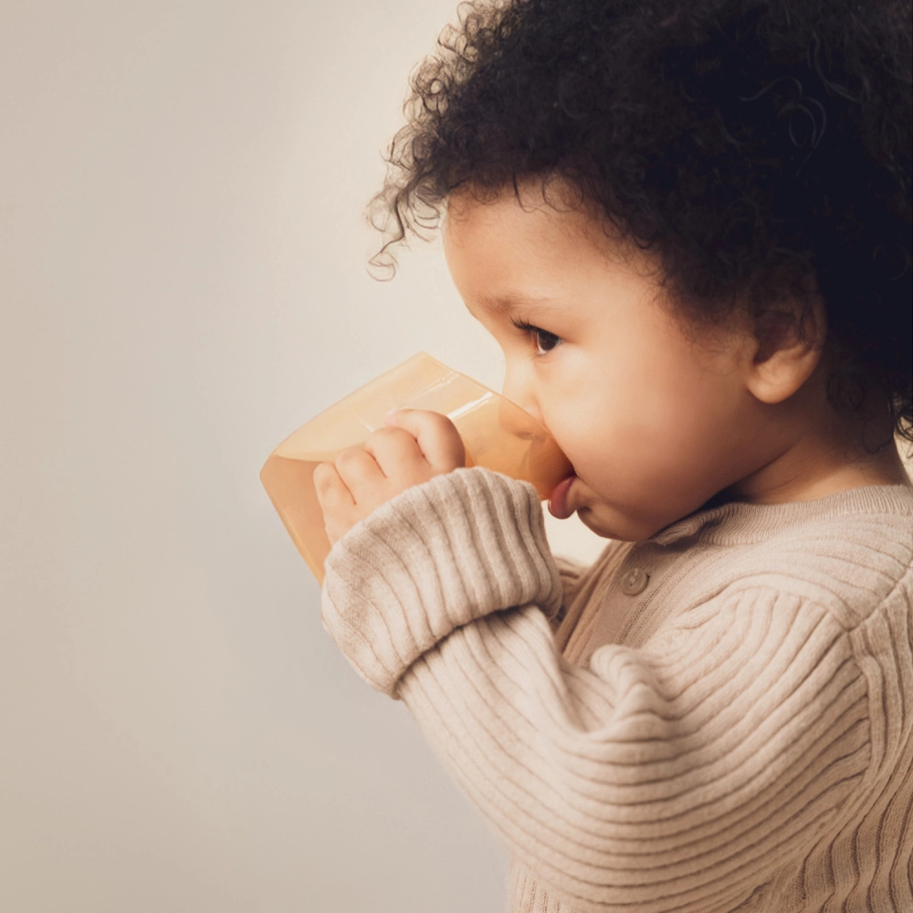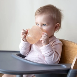 Die leichte Konstruktion, profilierte Doppelgriffe und das kleinere Anfangsvolumen (ca. 130 ml mit Einsatz) erleichtern den Übergang von der Flasche. Sobald das Kind bereit ist, nehmen Sie den Einsatz einfach heraus und erhalten einen offenen Becher mit 150 ml – ein Produkt, das wirklich mit dem Kind mitwächst.