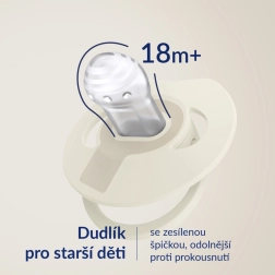 Der Sauger aus unterschiedlich starkem Silikon dehnt sich beim Saugen natürlich aus und zieht sich zusammen, unterstützt das Stillen und beeinträchtigt die Sprach- und Bissentwicklung nicht*.