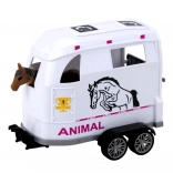 Der weiße zweiachsige Anhänger mit Pferdeaufdruck lässt sich leicht abkoppeln. Innen befindet sich eine Pferdefigur für eigenständiges Spiel.