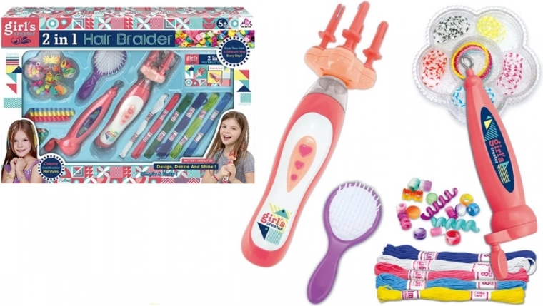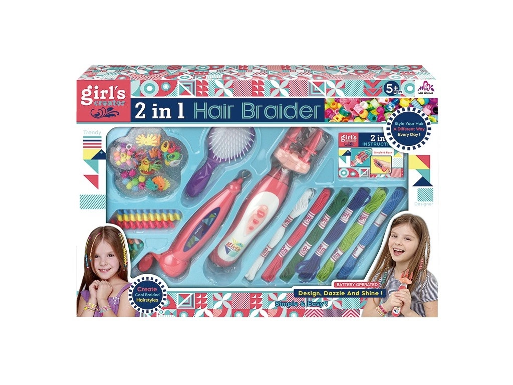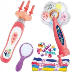 Im Set finden Sie alles für den sofortigen Start: einen Einfädler für schnelle Arbeitsschritte, verschiedene Perlen für bunte Kombinationen, einen Kamm zum Stylen, Stickgarne und Haargummis zur Fixierung sowie ein Flechtgerät für 2× AA-Batterien. Geeignet für Kinder ab 3 Jahren.