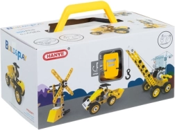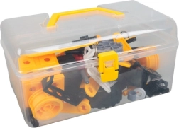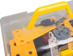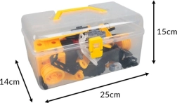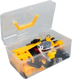 Dieser Bausatz für kleine Konstrukteure bietet ein umfangreiches Set an interaktiven Teilen, darunter Räder, Zahnräder, Schrauben und Werkzeuge, mit denen Kinder verschiedene fahrbare Fahrzeuge und einfache mechanische Modelle zusammensetzen. Alles ist übersichtlich in einer robusten Aufbewahrungsbox mit Griff verstaut, sodass der Bausatz leicht zu transportieren und zu lagern ist.