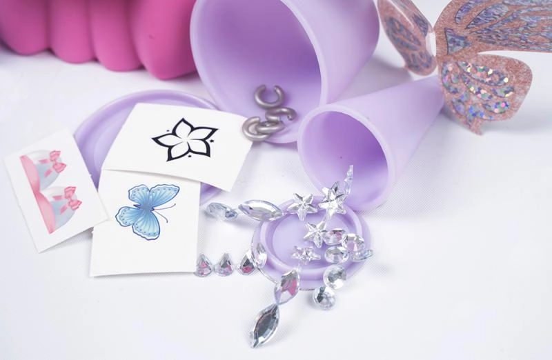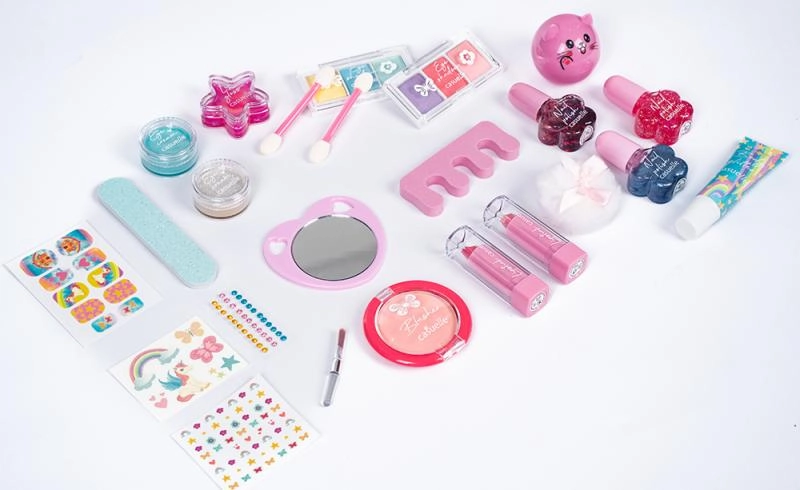 Kinderkosmetik und Accessoires: Lippenstifte/Glosse, Nagellacke, Lidschatten, Rouge, Applikatoren, Pinsel, Spiegel, Feile, Zehenspreizer, Sticker, Glitzer (Zusammenstellung und Farben können variieren)