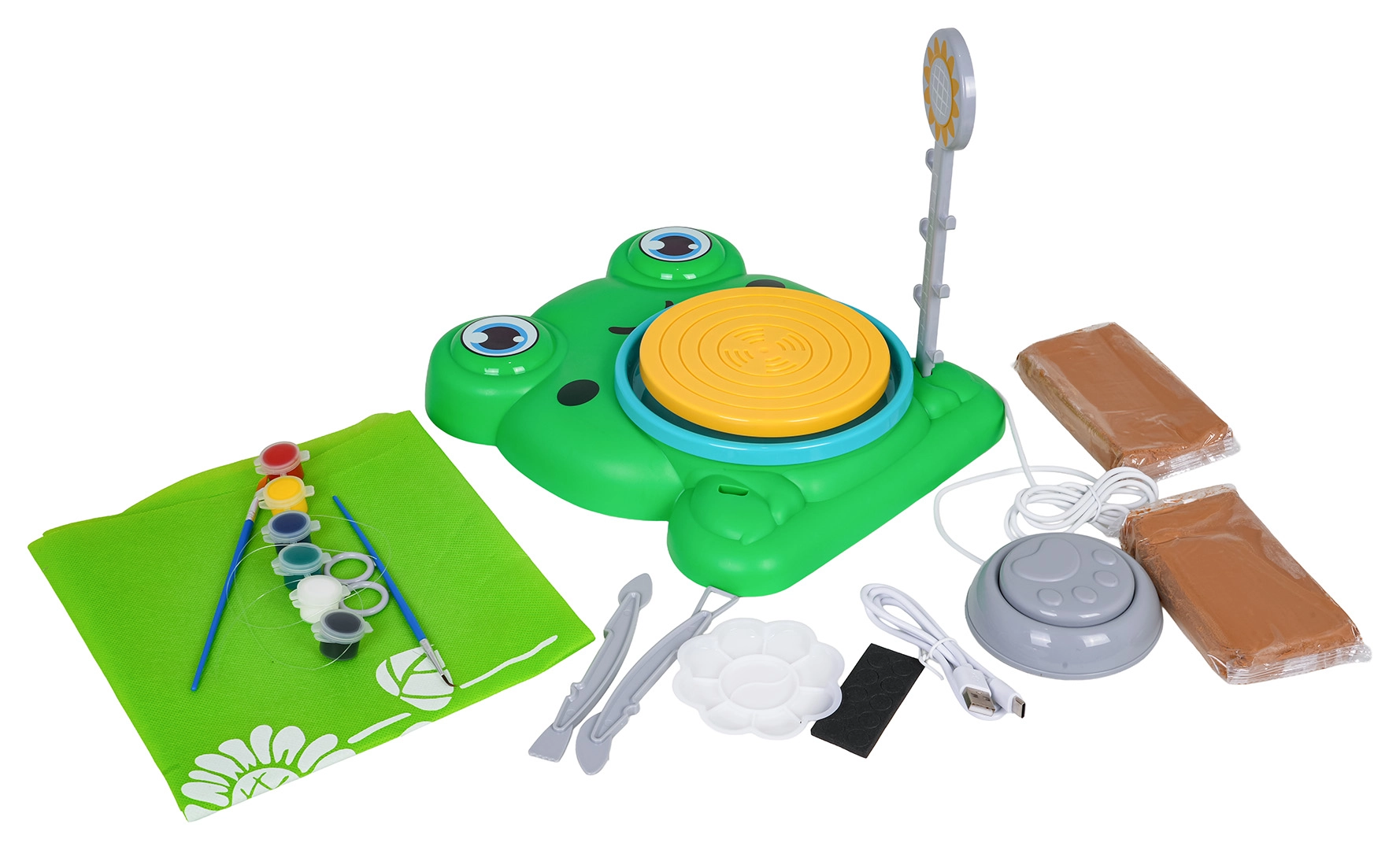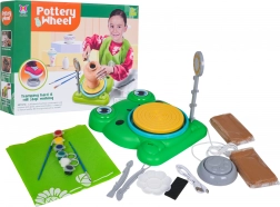 Froschförmige Basis, Drehteller, Fußpedal, Lampe, Werkzeuge, Farben und 2× Ton – alles für sofortiges Formen und Bemalen.