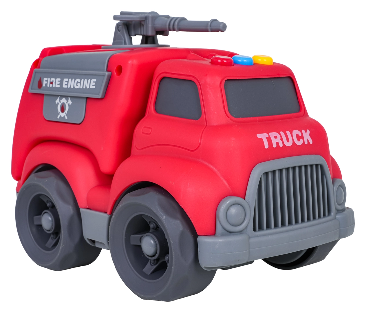 Auf dem Dach des Autos befinden sich leicht zugängliche Tasten für Start-, Fahr- und Rückfahrgeräusche sowie eine fröhliche Melodie. Kinder begeistert außerdem das dreh- bzw. ausziehbare Löschrohr und die öffnende Heckklappe. Das Spielzeug ist sofort einsatzbereit – 4× LR44-Batterien sind im Lieferumfang enthalten.
