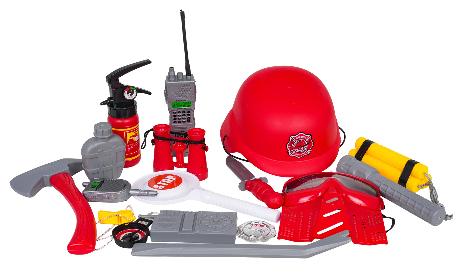 transparenter Rucksack, Helm, Schutzbrille mit Maske, Löschflasche, STOP-Schild, Abzeichen, Messer, Brechstange, Walkie-Talkie, Pfeife, Feldflasche, Telefon, Radio, Kompass, Taschenlampe, Axt, Fernglas, Attrappe von Dynamit.