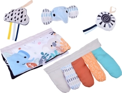 Enthalten sind eine weich gepolsterte Lernmatte, ein praktisches U-Kissen in Elefantenform für angenehme Unterstützung sowie ein buntes Set an Spielzeugen mit unterschiedlichen Oberflächen. Dank der einfachen Montage und der leichten Konstruktion lässt sich der Spielbogen schnell zusammenklappen und auf Reisen mitnehmen.
