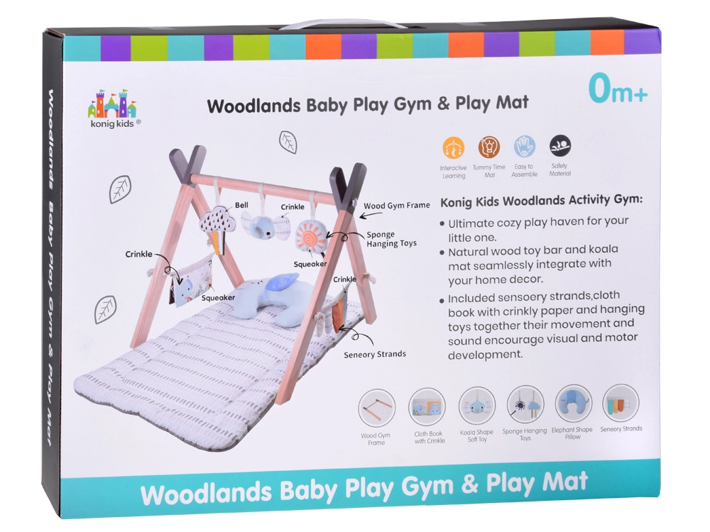 Der stilvolle Holz-Spielbogen bietet dem Baby eine bequeme Fläche in Bauch- wie Rückenlage, während weiche Hänge-Spielzeuge zum Ausstrecken, Greifen und Entdecken verschiedener Texturen einladen. Kontrastreiche Elemente, raschelnde Materialien und Quietsch-Elemente stimulieren auf natürliche Weise Sehen, Hören und Tastsinn.