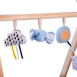Weiche hängende Spielzeuge – Wölkchen mit Bändchen, Sonne und kleiner Elefant – fördern die visuelle Wahrnehmung, die Hand-Auge-Koordination und die ersten Greifversuche.