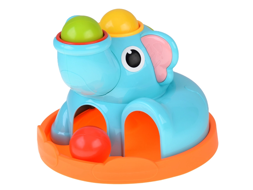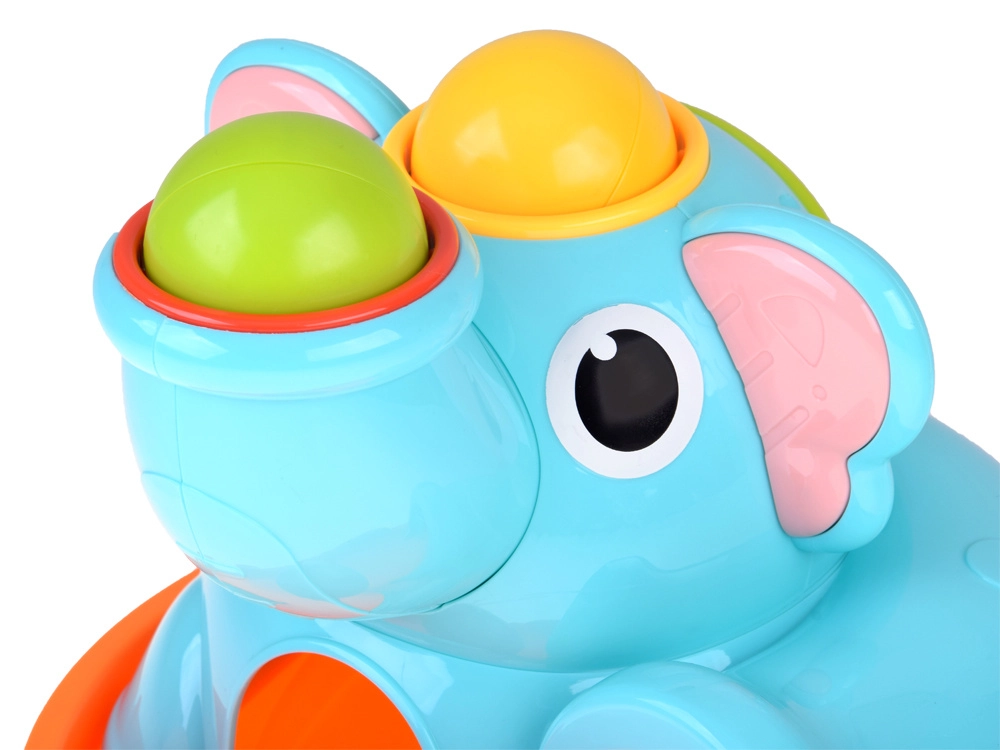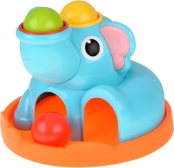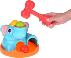 Der niedliche Elefant auf einer stabilen Basis begeistert Kinder mit seinen leuchtenden Farben und abgerundeten Formen. Enthalten sind ein roter Hammer und drei bunte Kugeln (rot, gelb, grün), die in die Öffnungen gelegt und hineingeklopft werden – die Kugeln rollen anschließend durch das Spielzeug und kommen wieder heraus, was zu weiteren Versuchen motiviert und das Verständnis von Ursache–Wirkung unterstützt.