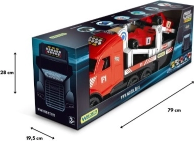 Der große Transporter Magic Truck Action Formula 1 begeistert alle kleinen Motorsport- und Rennfans. Die realistisch gestaltete Zugmaschine mit langem Auflieger transportiert zwei beiliegende F1-Boliden, die sich mithilfe von Rampen leicht aufladen lassen. Der Auflieger ist abnehmbar und kann auf zwei Arten an die Fahrerkabine gekoppelt werden – das erweitert die Spielmöglichkeiten.