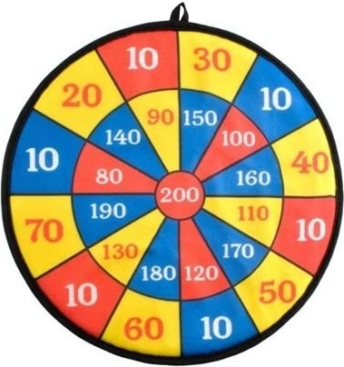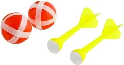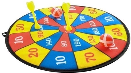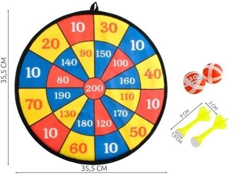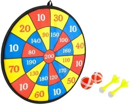 Klassische Dartscheibe – mit Bällen und Pfeilen mit Klettverschluss. Ein ideales Spielzeug, das Genauigkeit trainiert und die Hand-Auge-Koordination fördert. Der Abstand zur Scheibe kann schrittweise vergrößert werden, was den Schwierigkeitsgrad des Spiels erhöht. Die Scheibe hat eine mit Fasergewebe überzogene Oberfläche, an der die mit feinen Häkchen versehenen Bälle gut haften. Dieses Klett-Dartspiel macht Kindern und Erwachsenen gleichermaßen Spaß.