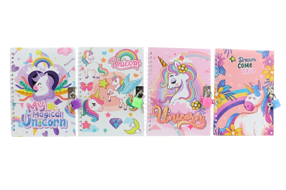 Stilvolles Notizbuch mit Einhornmotiv und praktischem Schloss für deine geheimen Gedanken. Es hat harte Umschläge, farbige linierte Seiten und im Set findest du 2 Schlüssel. Ideal zum Führen eines Tagebuchs, für Notizen und Ideen, die du sicher aufbewahren möchtest.