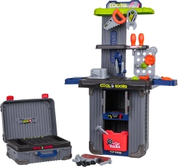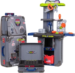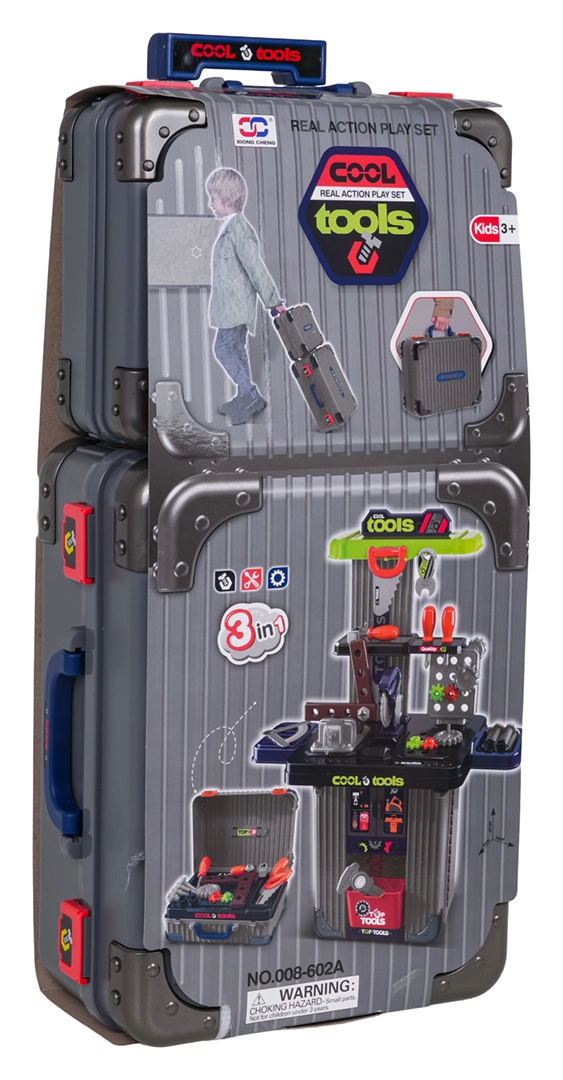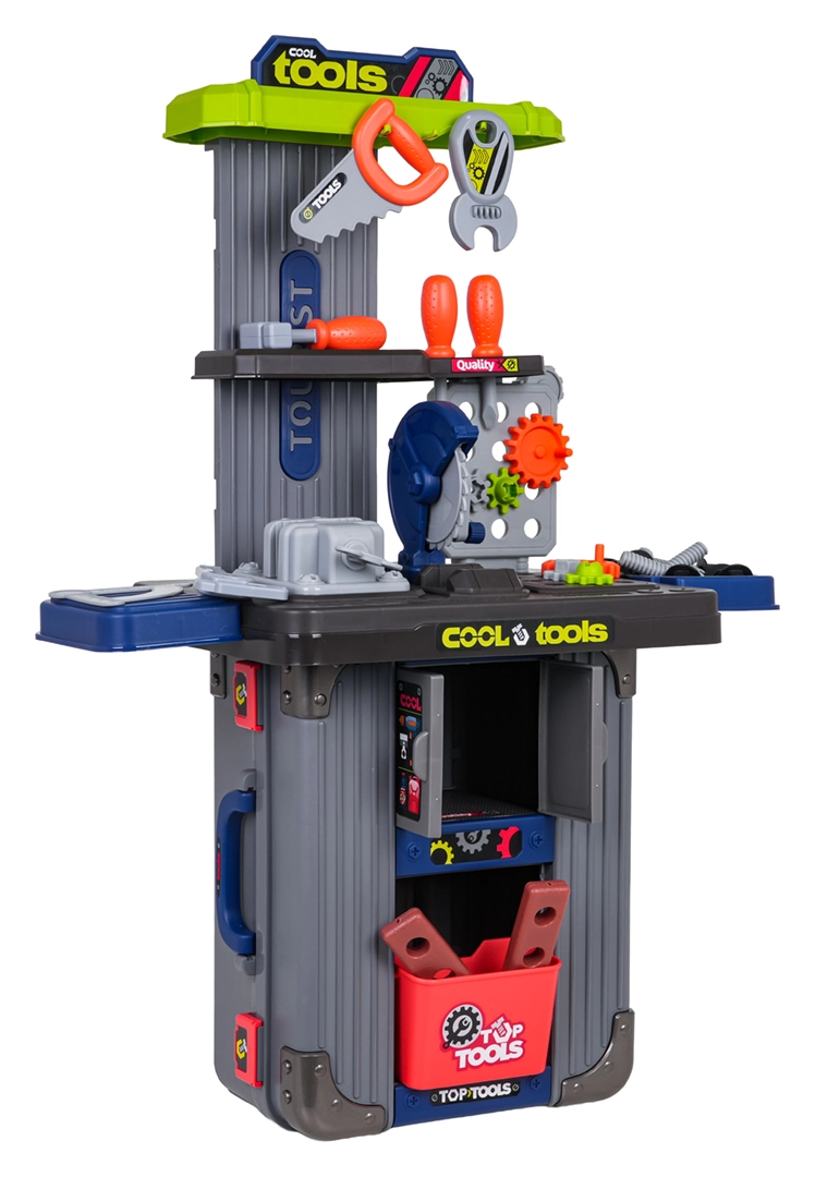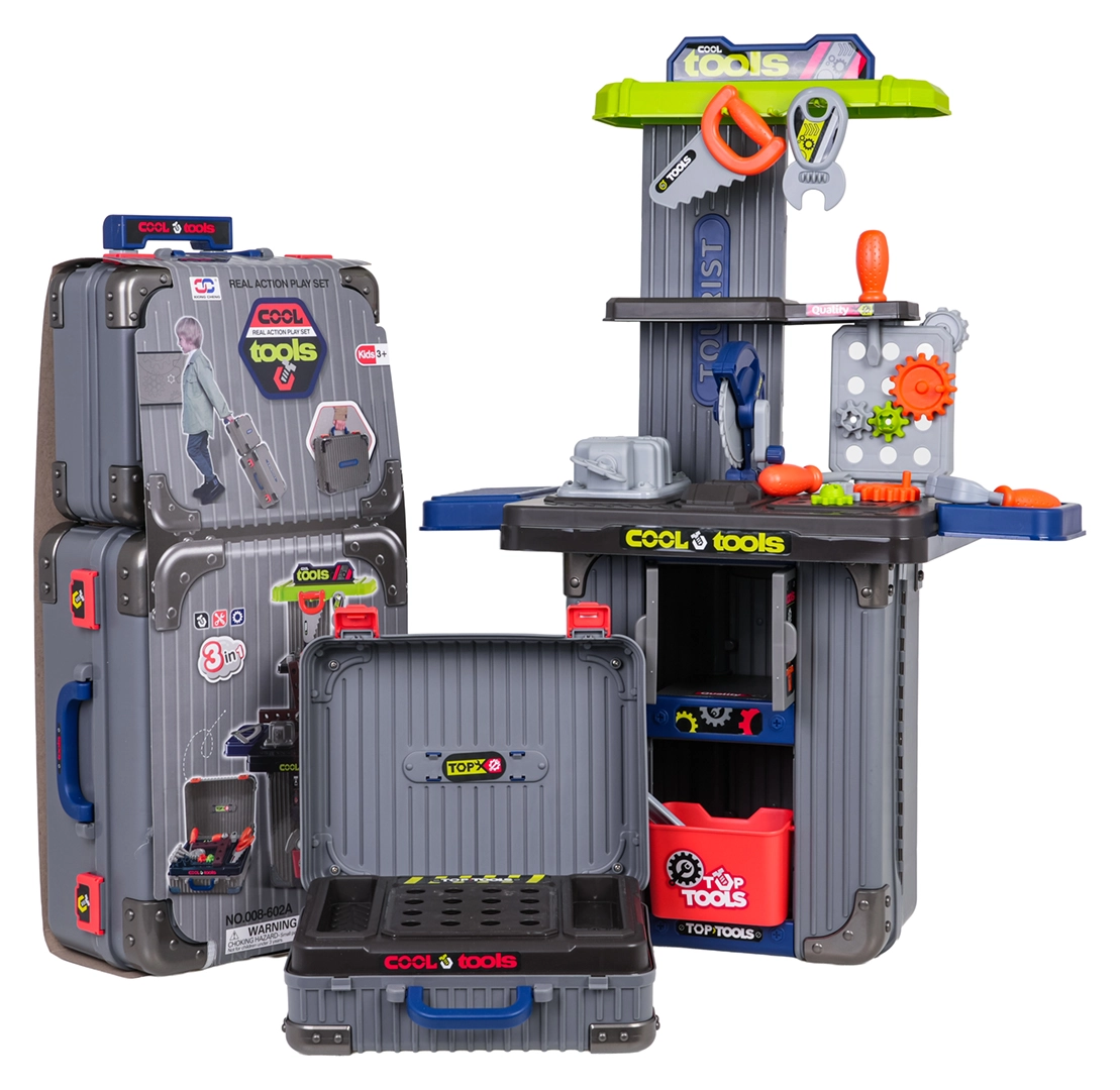 Dieses clevere 3-in-1-Set kombiniert zwei Koffer und ein umfangreiches Werkzeugsortiment zu einer mobilen Werkstatt. Kinder bauen mühelos ihre eigene Werkbank mit Schraubstock, Ablagen und Lochwand und räumen nach dem Spielen alles wieder in die mobilen Koffer. Hochwertiger Kunststoff hält intensiver Nutzung stand und sorgt für lange Lebensdauer.