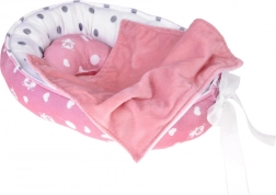 Die textile Wiege mit gepunktetem Futter und Schleife bietet der Puppe einen gemütlichen Rückzugsort. Kinder können sie leicht tragen und das Baby jederzeit und überall zum Schlafen legen.