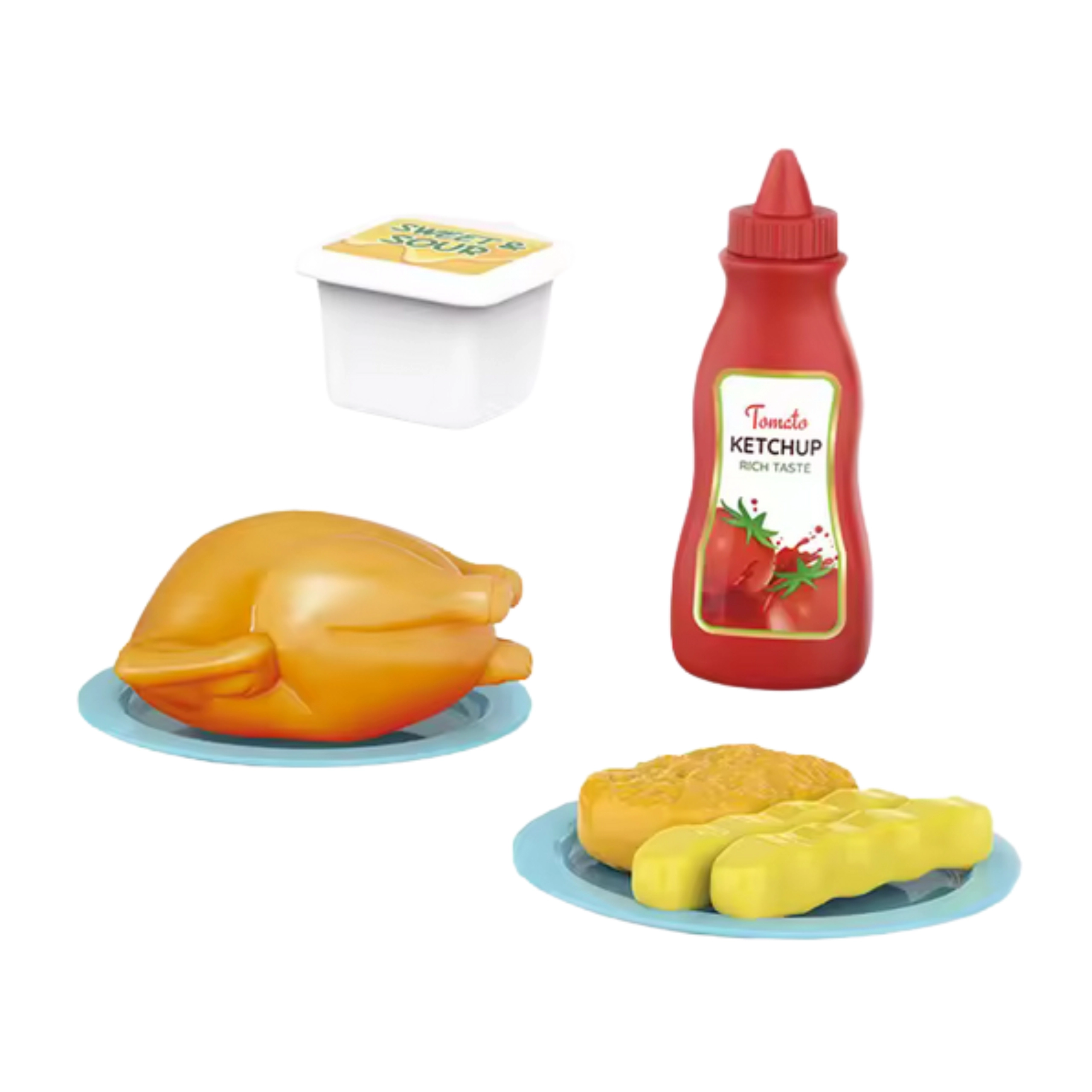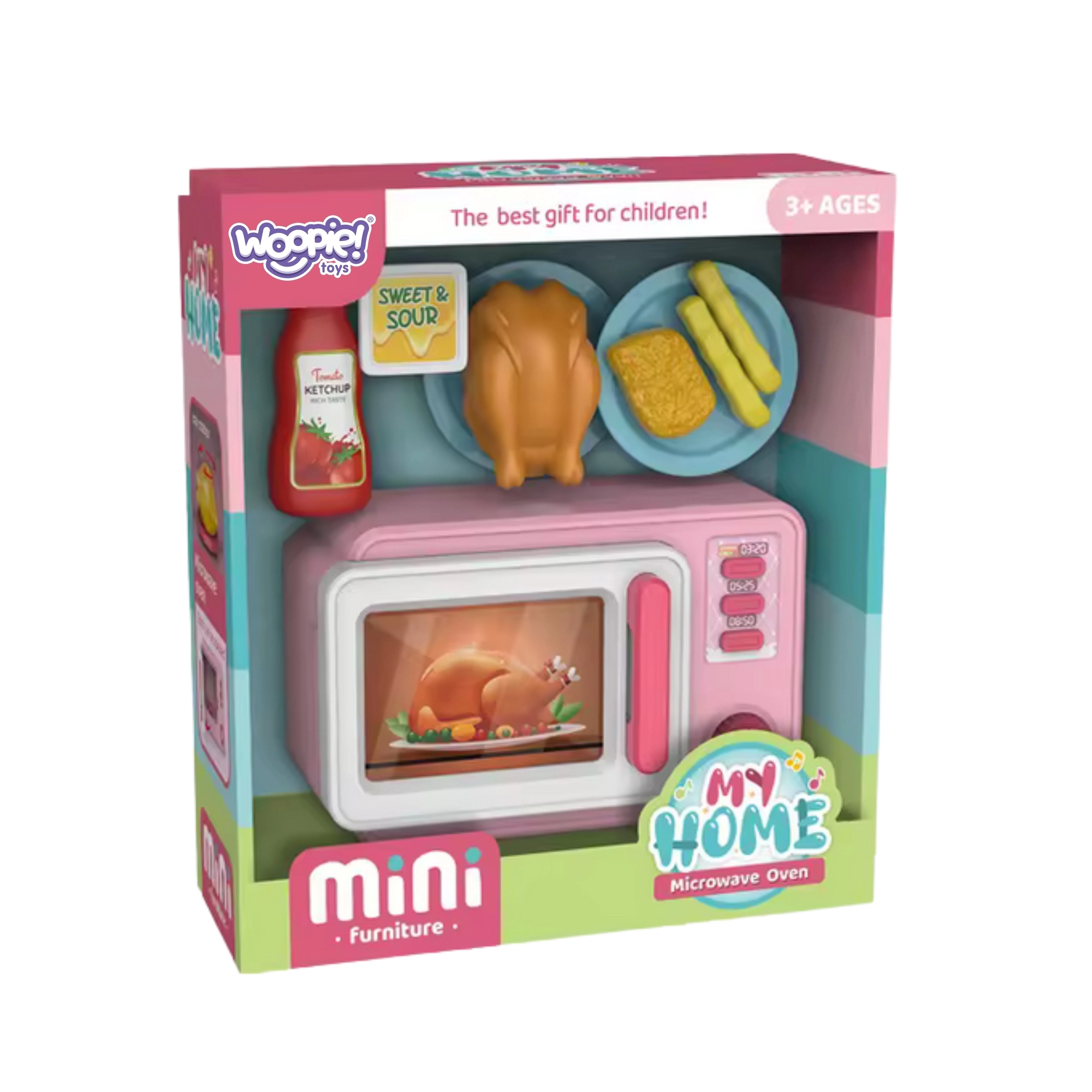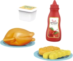 Im Set enthalten: interaktive Mikrowelle, Plastik-Hähnchen, 2× Pommes, 1× Nugget, Becher mit Soße, Ketchupflasche, 2 Tellerchen.