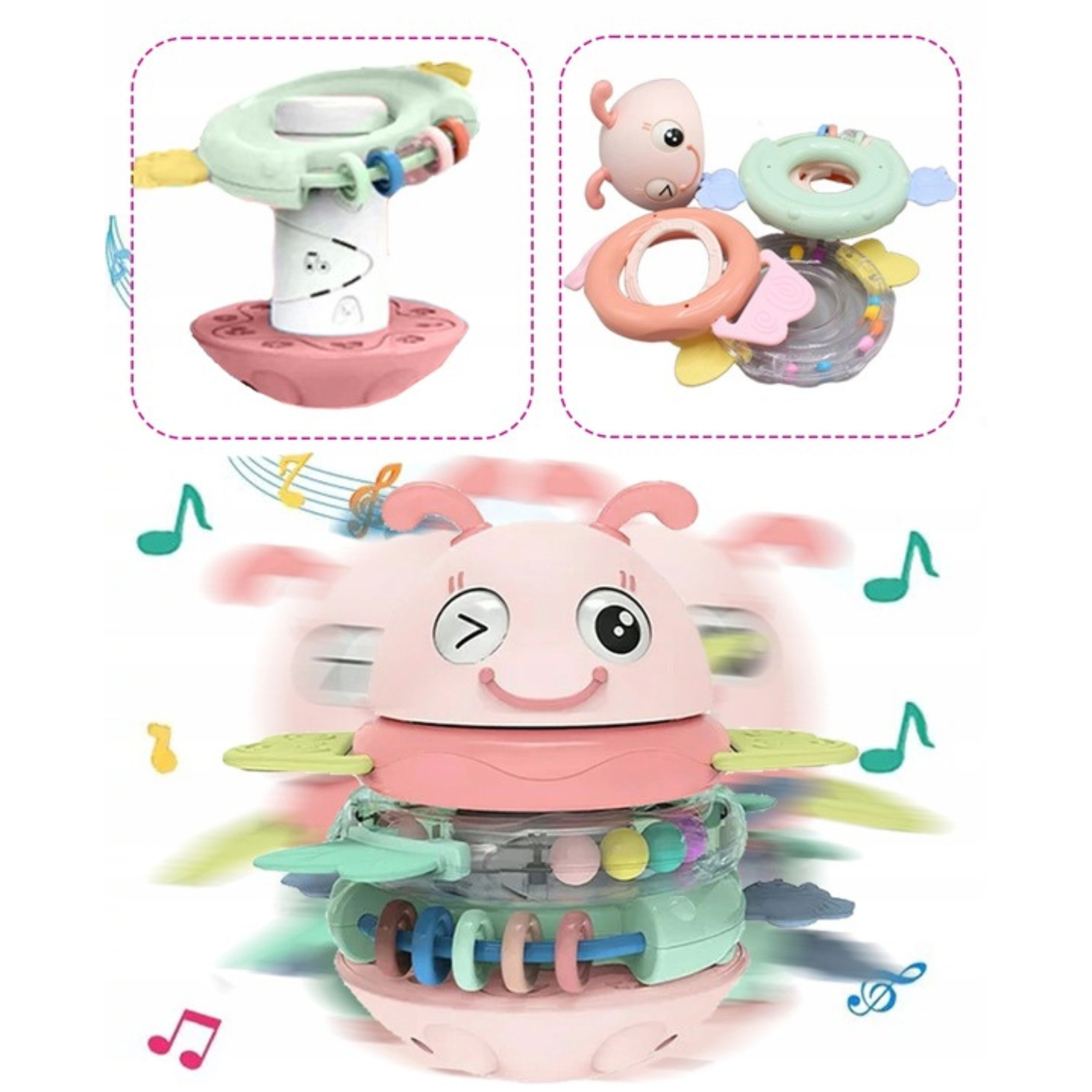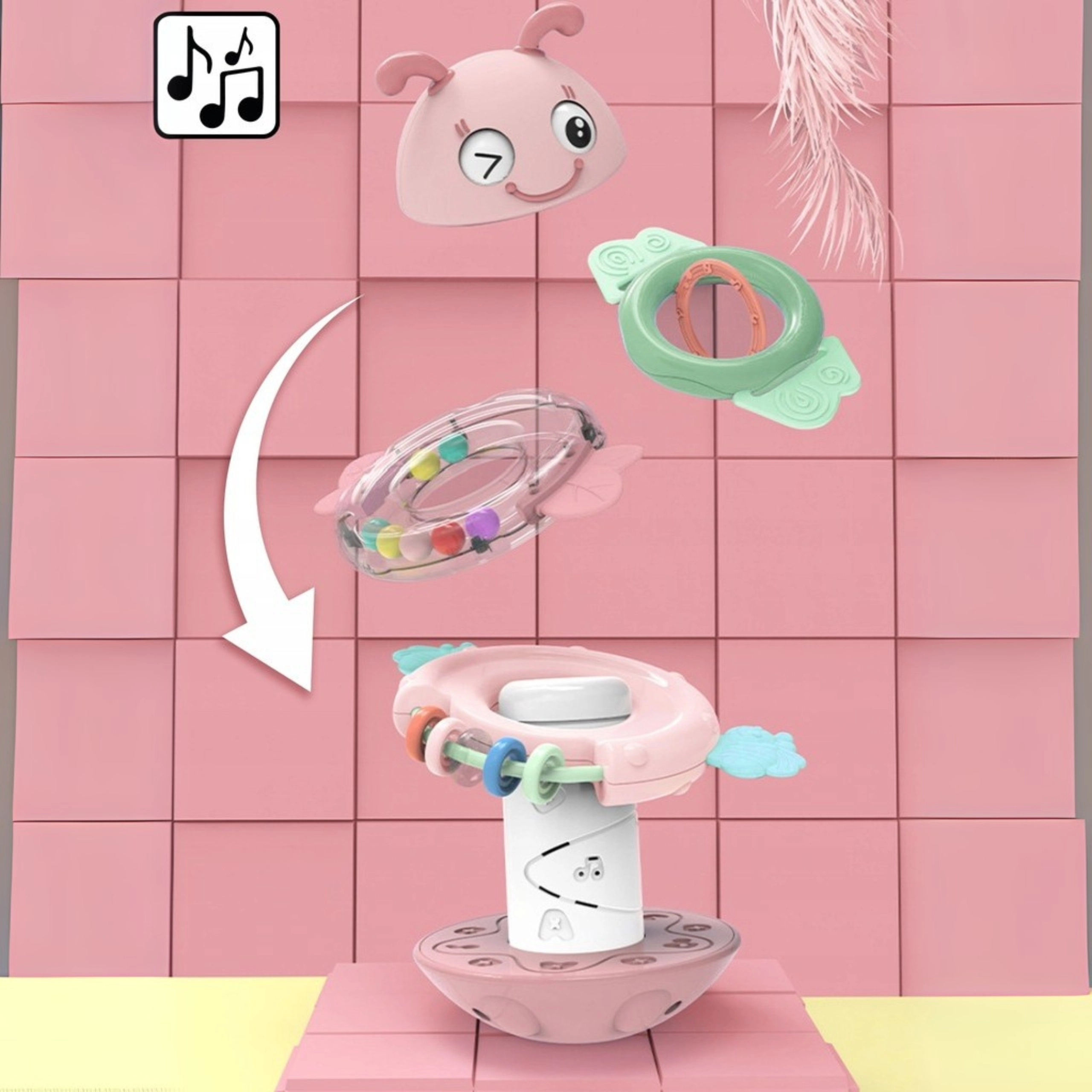 Suchen Sie ein Babyspielzeug, das fasziniert, das Zahnfleisch beruhigt und zugleich die Entwicklung fördert? Diese rosa Biene von WOOPIE ist ein multifunktionales sensorisches Spielzeug, geeignet ab den ersten Lebensmonaten. Die Ringe können einzeln als Beißringe und Rasseln verwendet oder auf den Stift aufgesetzt werden – das Spielzeug spielt dann ein Lied oder gibt ein lustiges Geräusch von sich. Die stabile, abgerundete Basis wiegt sich sanft und motiviert das Kind zum wiederholten Erkunden.