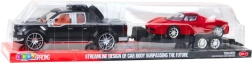 Schwarzer Pick-up mit Anhänger und rotem Sportflitzer bilden ein realistisches Set für thematisches Spiel.