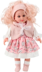 Die entzückende Puppe SWEET ANGEL mit einer Höhe von 36 cm bezaubert mit zarten Gesichtszügen, langen blonden Haaren und einem eleganten Outfit. Sie trägt ein rosa Blumenkleid mit weißem Kragen, eine rosafarbene ärmellose Weste, ein passendes Haarband und Socken. Ideal für Rollenspiele, die Förderung von Kreativität und Fürsorge.