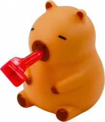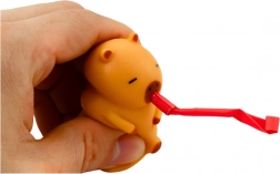 Die braune Capybara mit roter Tröte besteht aus angenehm weichem und elastischem Material, das sich hervorragend drücken lässt und die Entspannung fördert. Beim Drücken wird ein Quietschgeräusch aktiviert und aus dem Mäulchen fährt eine Tröte heraus – ein großartiges Antistress-Accessoire und zugleich origineller Gruppenspaß.