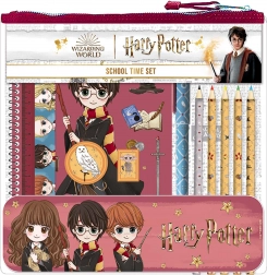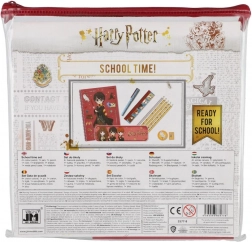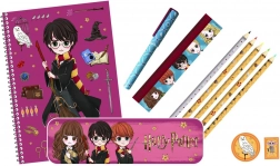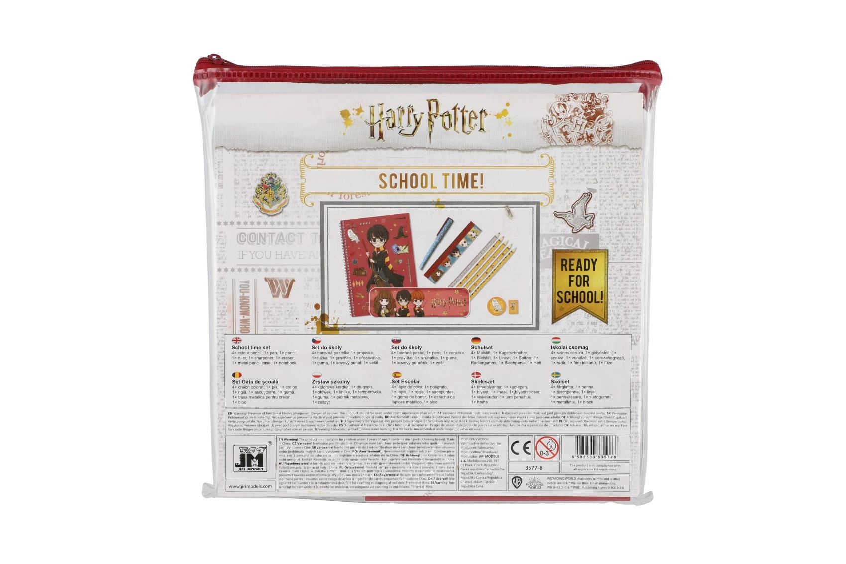 Stilvolles Schulset mit HARRY POTTER-Motiv in einem transparenten Kunststoffetui, das alles enthält, was kleine (Vor-)Schulkinder brauchen: Federmäppchen, Lineal, Bleistift, 4 Buntstifte, Radiergummi, Anspitzer, Kugelschreiber und Notizblock. Ideal zum Schreiben, Zeichnen und Notieren – in der Schule und unterwegs.