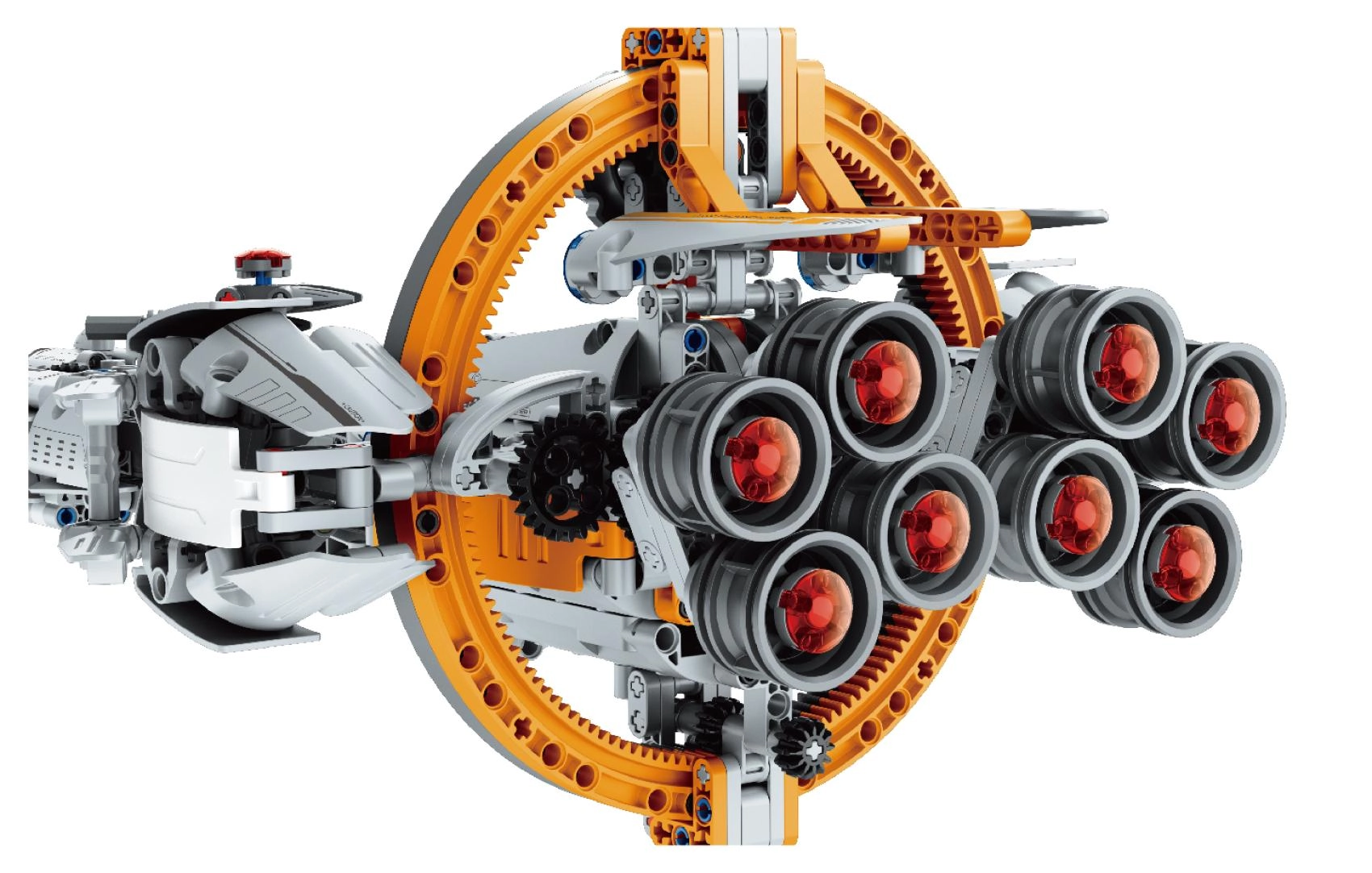 Das Heck der Konstruktion wird von einem Ensemble aus Triebwerken mit orangefarbenen Akzenten und detaillierter Ausarbeitung geprägt – für den Effekt eines dynamischen Flugs.